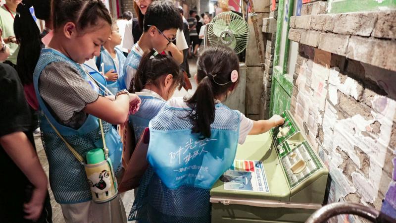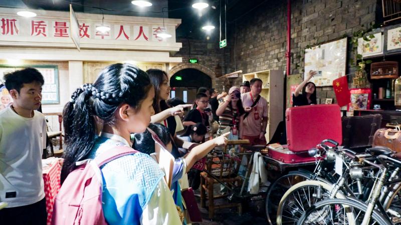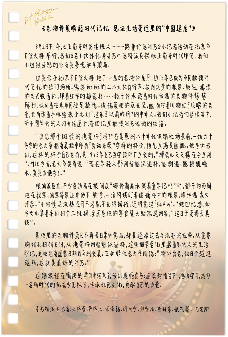 在小记者笔下,和平菓局带他们开启了一场新奇的时光探索之旅。“锈迹斑斑的二八大杠自行车、边角泛黄的粮票、旋钮掉漆的老式收音机、印着红字的搪瓷杯……数十件承载着时代体温的老物件静静陈列,吸引着往来市民驻足观看。玻璃展柜的反光里,既有对着旧物红了眼眶的老者,也有举着手机给孩子比划‘这东西以前咋用’的中年人。”既能在复古的场景中购物,又能在还原度极高的场景下身临其境般地感受城市的变迁,找到记忆中的共鸣。小记者感慨道:“从凭票购物到扫码支付,从搪瓷杯到智能保温杯,这些细节变化里藏着几代人的生活印记,更映照着国家日新月异的发展。”