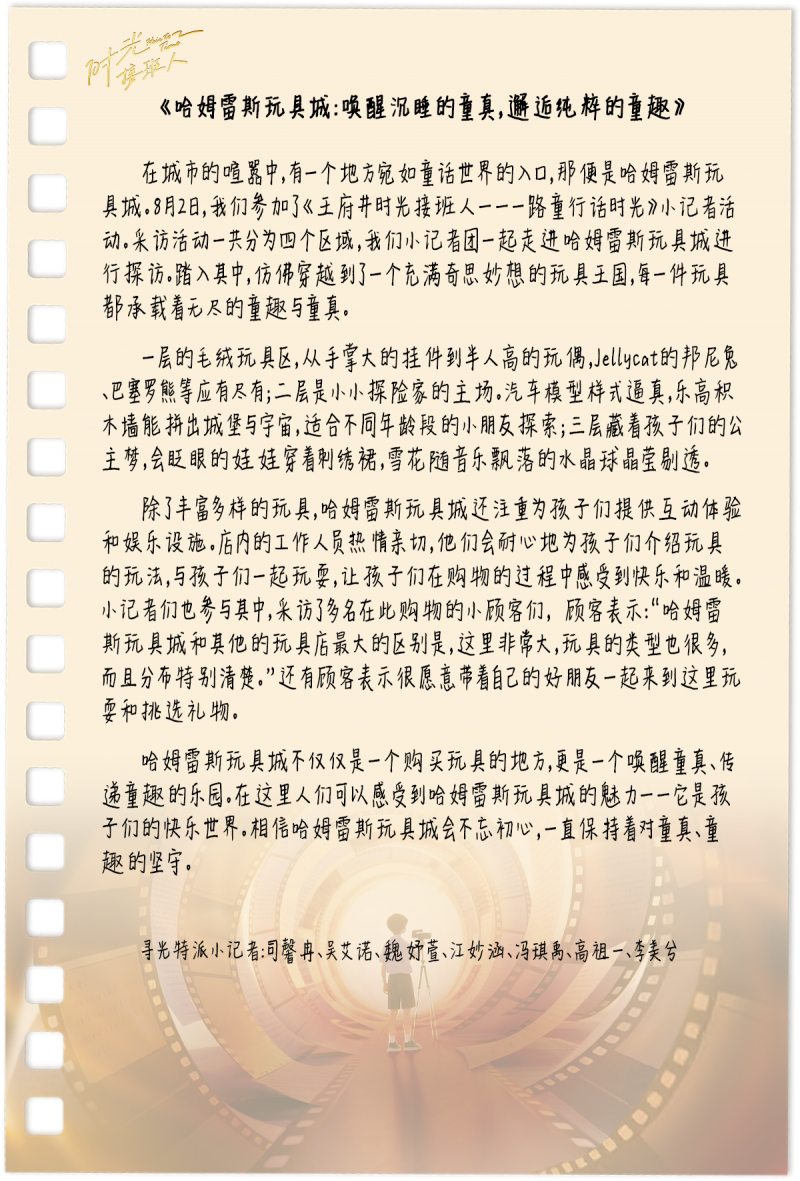 哈姆雷斯玩具店里,“时光探秘员”们笑声不断。究竟是怎样有趣的地方给第三组小记者留下如此深刻的印象?在小记者的笔下可见一斑——“一层的毛绒玩具区,从手掌大的挂件到半人高的玩偶,Jellycat的邦尼兔、巴塞罗熊等应有尽有;二层是小小探险家的主场,样式逼真的汽车模型,能拼出城堡与宇宙的乐高积木墙;三层藏着女孩子们的公主梦,穿着刺绣裙会眨眼的娃娃,随音乐飘落雪花的水晶球。”“这里不仅仅是一个购买玩具的地方,更是一个唤醒童真、传递童趣的乐园。”哈姆雷斯玩具城是北京市百货大楼里一道亮丽的风景线,它以玩具作为媒介,传递着童趣与欢乐。在这里,不论小朋友还是大朋友,都能找到属于自己的快乐选择。