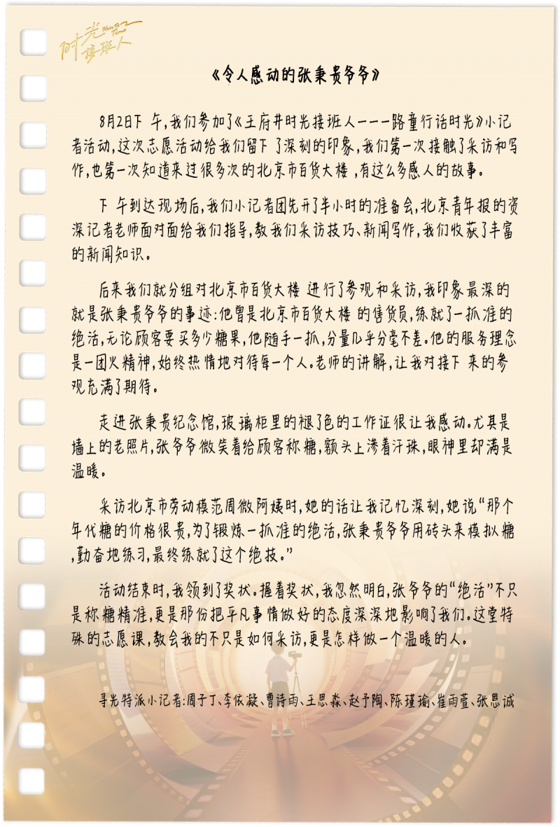 泛黄的工作证、磨亮的售货台,以及张秉贵为练就“一抓准”将砖头磨成糖果大小练习的故事,让“一团火”精神可触可感。这段深刻的体验,深深触动了小记者们的心,更在文字中表达出了这份细腻的回响:“握着小记者奖状,我忽然明白,张爷爷的“绝活”不只是称糖精准,更是那份把平凡事情做好的态度。这堂特殊的志愿课,教会我的不只是如何采访,更重要的是如何做一个温暖的人。”