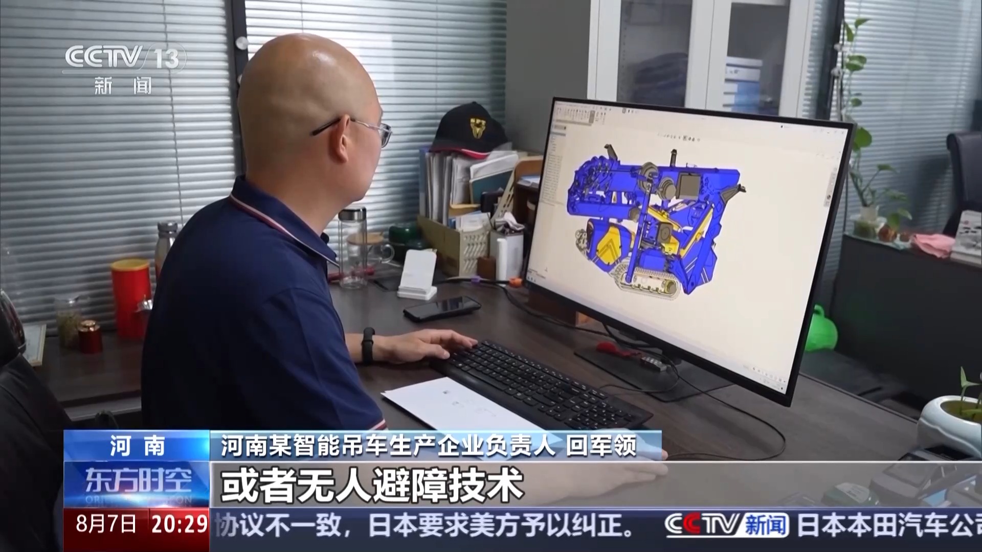 河南某智能吊车生产企业负责人 回军领:我们发明了一个液压飞臂,我可以在主臂的基础上再增加三节的副臂,进行一个空中的二次变轨,二次转向,这是传统的直臂式的起重机完全无法达到的。我们利用了很多编程技术,传感器技术或者无人避障技术,这就是得益于我们中国强大的产业链、人工智能的快速发展。