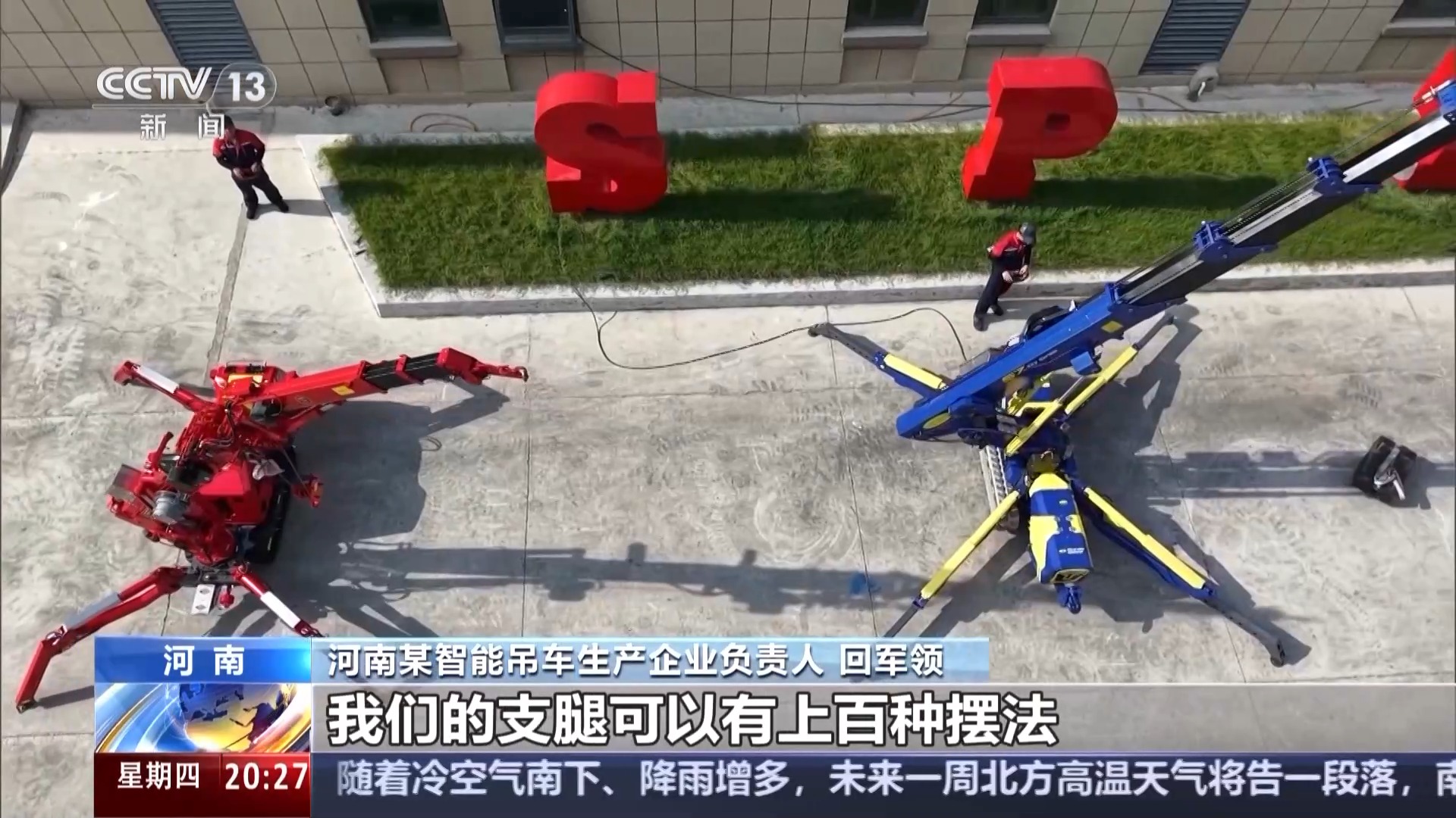 河南某智能吊车生产企业负责人 回军领:传统的这种蜘蛛吊最多就是四五种摆法,但是我们的这一款蜘蛛吊,可以有上百种摆法。摆动幅度可以达到厘米级,甚至毫米级的维度,用来安装设备,用来安装螺丝,效果非常好。当你不小心把它旋转到危险区域的时候,这个时候它会自动报警,自动停止,例如这样的黑科技我们有很多。