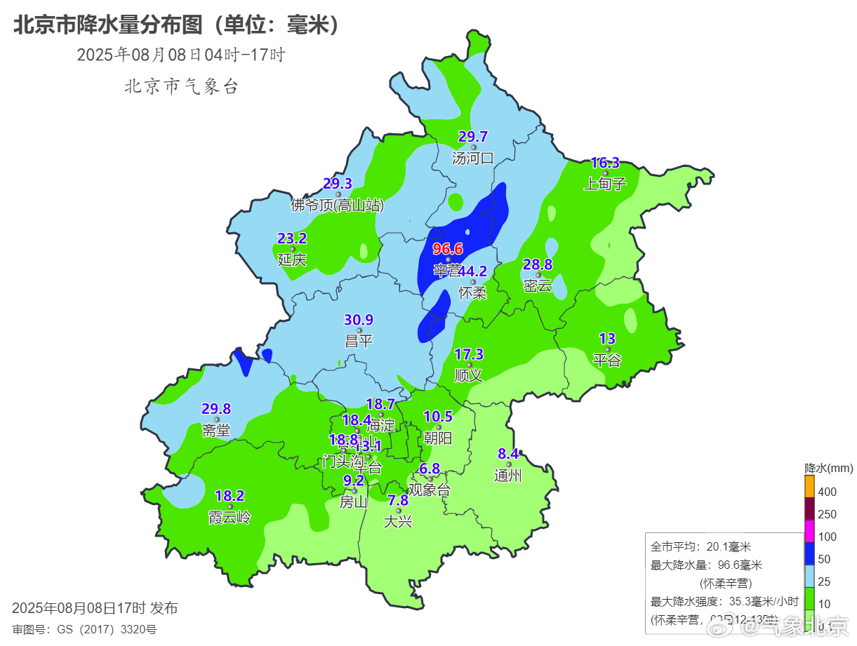 8日04时至17时全市平均降水量20.1毫米,城区平均17.2毫米,最大降水量出现在怀柔辛营96.6毫米。最近一小时(16-17时)最大降水量为密云坟庄8.9毫米。西北部降水已有所减弱。