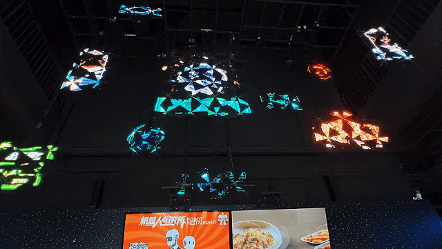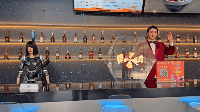 机器人酒保“希尔”和“小柒”在吧台迎客,仿人机器人李白和苏轼讲脱口秀,机器狗朝我作揖、翻跟头,恐龙机器人爬向我“求摸摸”,机器人乐队“尽情摇滚”,送餐机器人、垃圾桶机器人穿梭在餐厅,够不够震撼!
