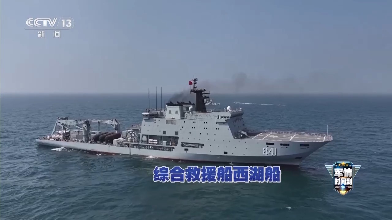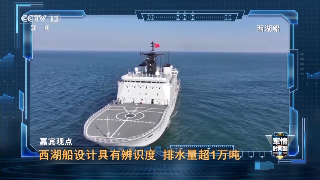 军事专家 魏东旭:参演兵力的变化和升级,体现出人民海军现代化建设过程当中取得一个又一个的新成果。西湖船的设计和外形非常具有辨识度。首先舰体比较大,据说排水量已经超过了1万吨,而且在舰体的前部,也就是前甲板的位置非常地平整,它设计有大型的直升机的起降点,个头比较大的舰载直升机,无论是转运人员,救援人员,或者像西湖船快速运送一些救援物资会变得比较方便。