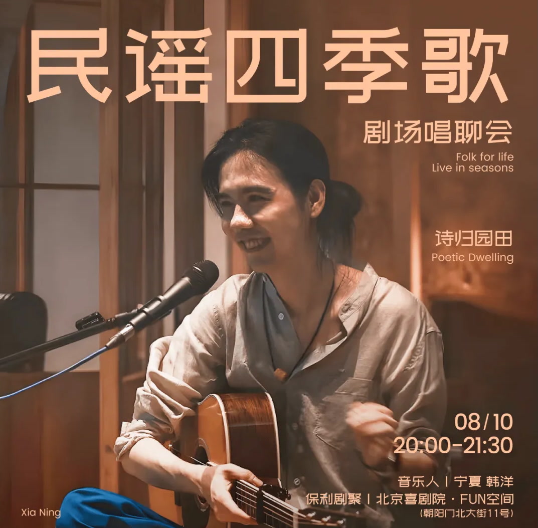 8月10日晚,音乐人宁夏将在北京喜剧院上演“民谣四季歌 剧场唱聊会”个人专场音乐会,用温暖细腻的民谣旋律和来自古诗词的浪漫情怀,呈现一场四季流转的音乐对话。