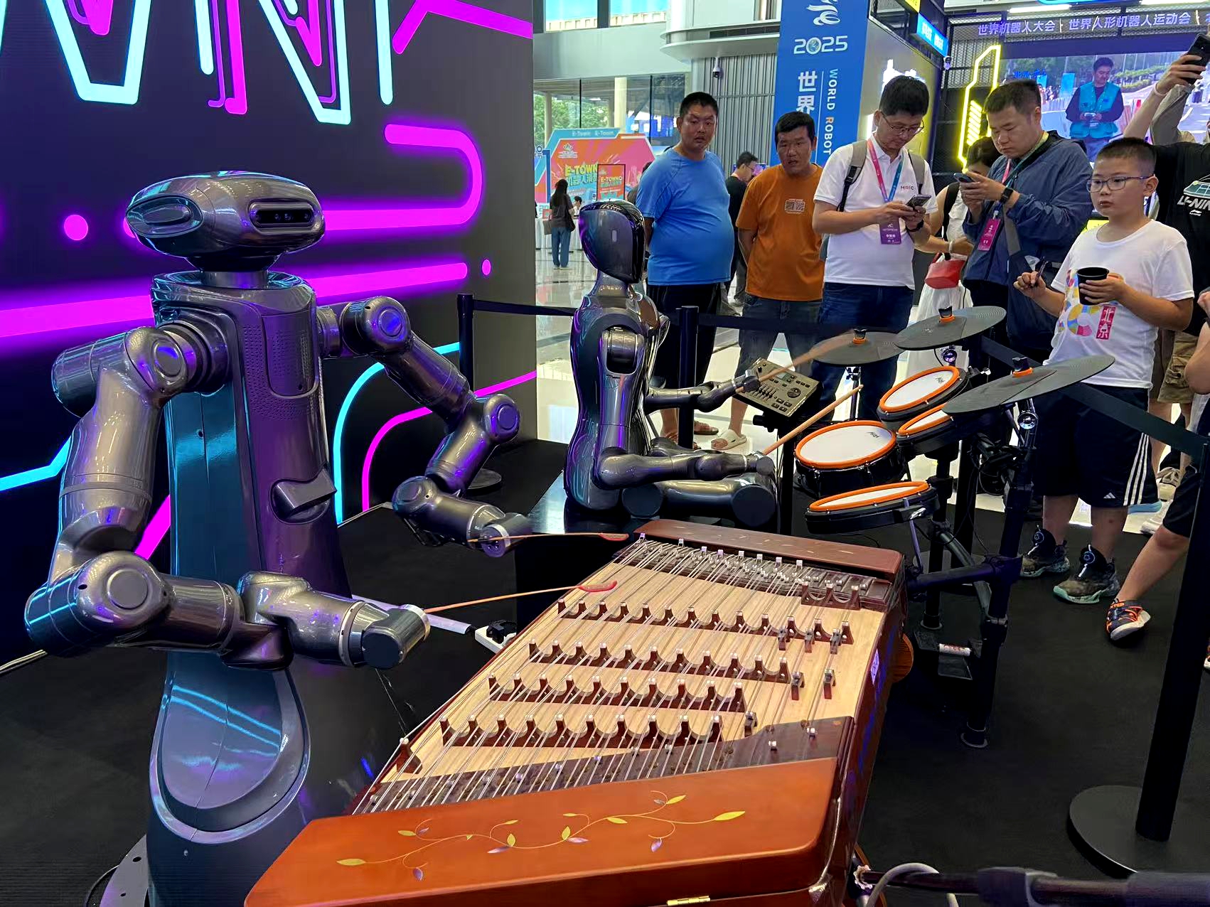 喧闹声浪中,一曲清新乐曲《青花瓷》让许多人不禁寻音而来。三位人形机器人演奏钢琴、扬琴,敲着架子鼓,配合默契。这场机器人乐手的小型音乐会,让观众觉得新奇又好玩。