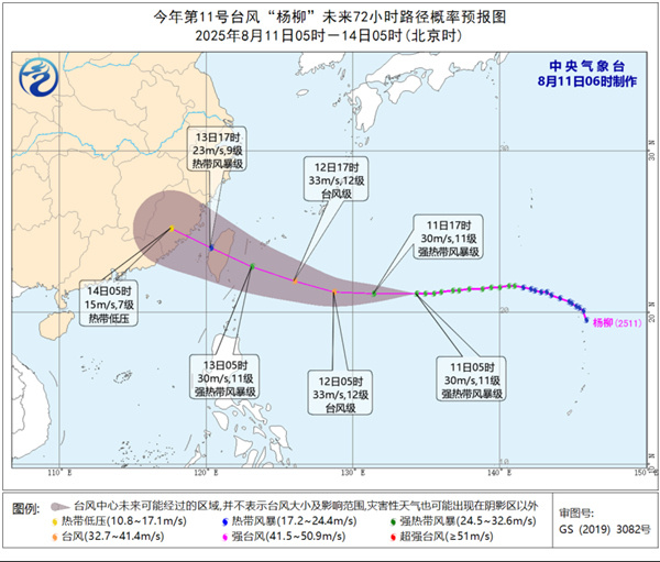据中央气象台消息,今年第11号台风“杨柳”(强热带风暴级)的中心今天(8月11日)早晨5点钟位于台湾花莲市东偏南方向大约1340公里的西北太平洋洋面上,就是北纬21.2度、东经134.3度,中心附近最大风力11级(30米/秒),中心最低气压980百帕,七级风圈半径为160~220公里,十级风圈半径为50~80公里。