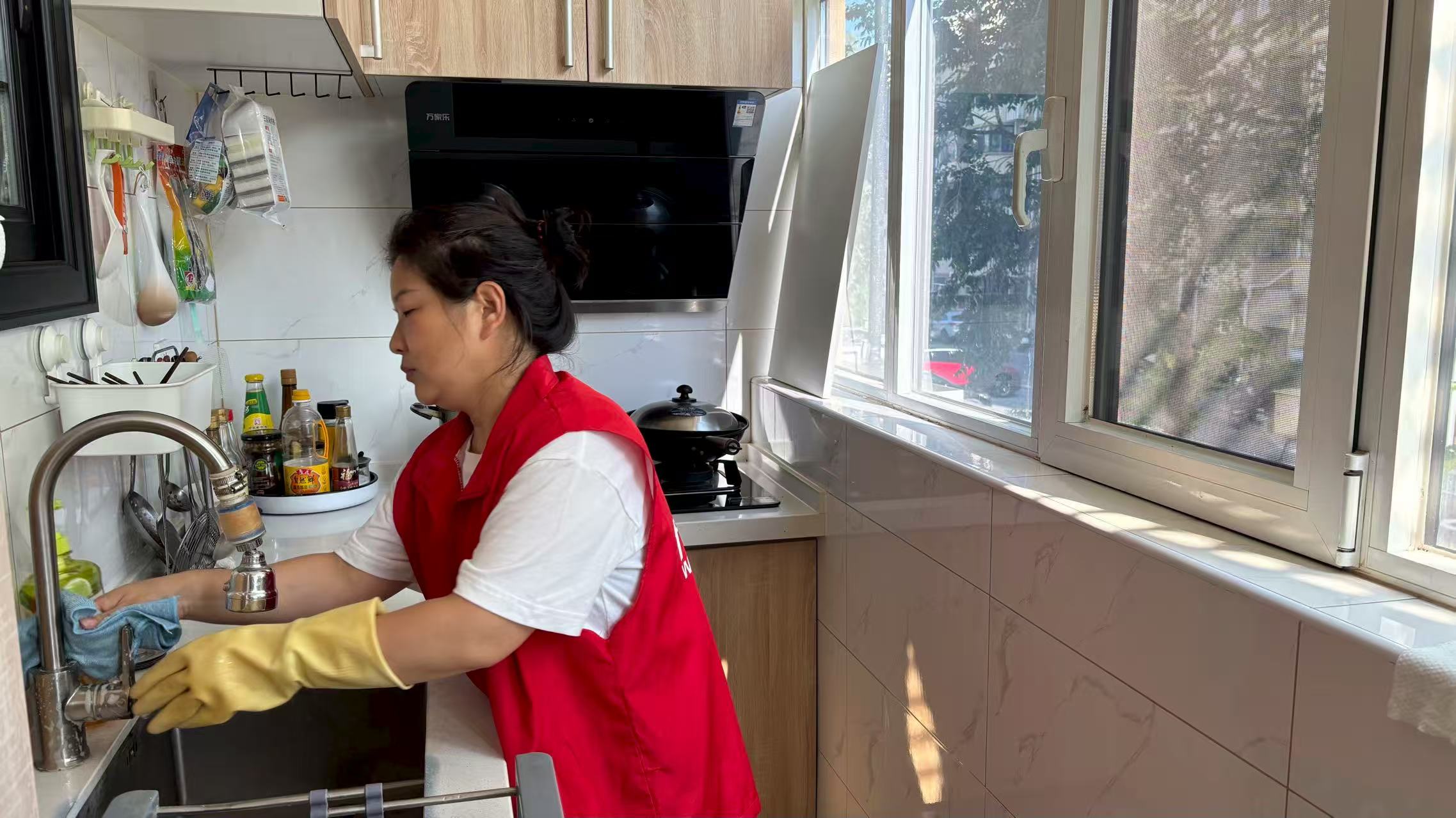 王丽动作麻溜,打扫卫生有自己的逻辑。先清理最内侧的厨房,柜子、灶台、水池……一路擦拭过来,再打扫中间的客厅、床下、桌面,最后到卫生间,擦拭墙壁、马桶、地面。打扫卫生间隙,她还迅速地帮张大爷老两口做了顿午餐。“大爷家卫生维护得比较好,孩子也经常帮着收拾,干活儿不费劲。有的老人家里,子女去得不勤,每个月就指望我们去呢,不抓紧时间都打扫不完。”