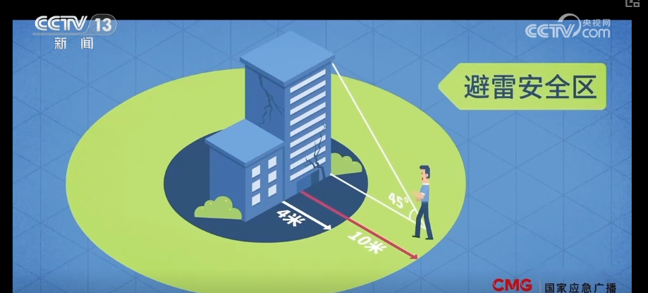 如果躲在山洞里,千万不要站在洞口或岩石边,尽量往里走。如果实在无处可躲,周围都是大树或废弃高楼,应尽快寻找安全避雷区。方法很简单,仰望视野中较高物体的顶点,视角达到45度以上,且人与物体距离4米以上,10米以内的区域就是避雷安全区。