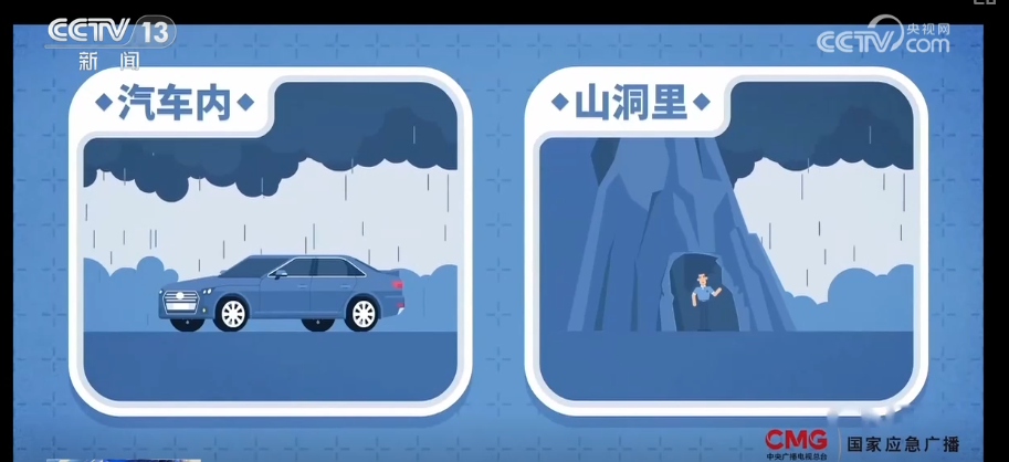 工作人员提示,如果雷雨天人在户外实在找不到合适的躲避场所时,待在车里相对来说也是安全的。驾驶员可以选择在安全区域停车,关掉音响等系统,并关闭所有车窗,使车辆形成一个完全封闭的空间。不要去触摸车窗把手、换挡杆、方向盘等,尽量把双手放在大腿上。如车辆遭遇雷击,不要贸然下车,在车内等待救援。