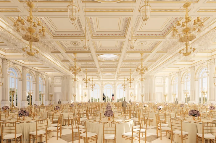 据美国《华盛顿邮报》8月10日报道,美国总统特朗普急于在白宫新建一座规模庞大的宴会厅,但该项目尚未提交给国家首都规划委员会(NCPC)审查。审查流程通常需要数年时间完成,但特朗普希望在9月启动改造项目,白宫方面已经公布宴会厅内部效果图(如图)。