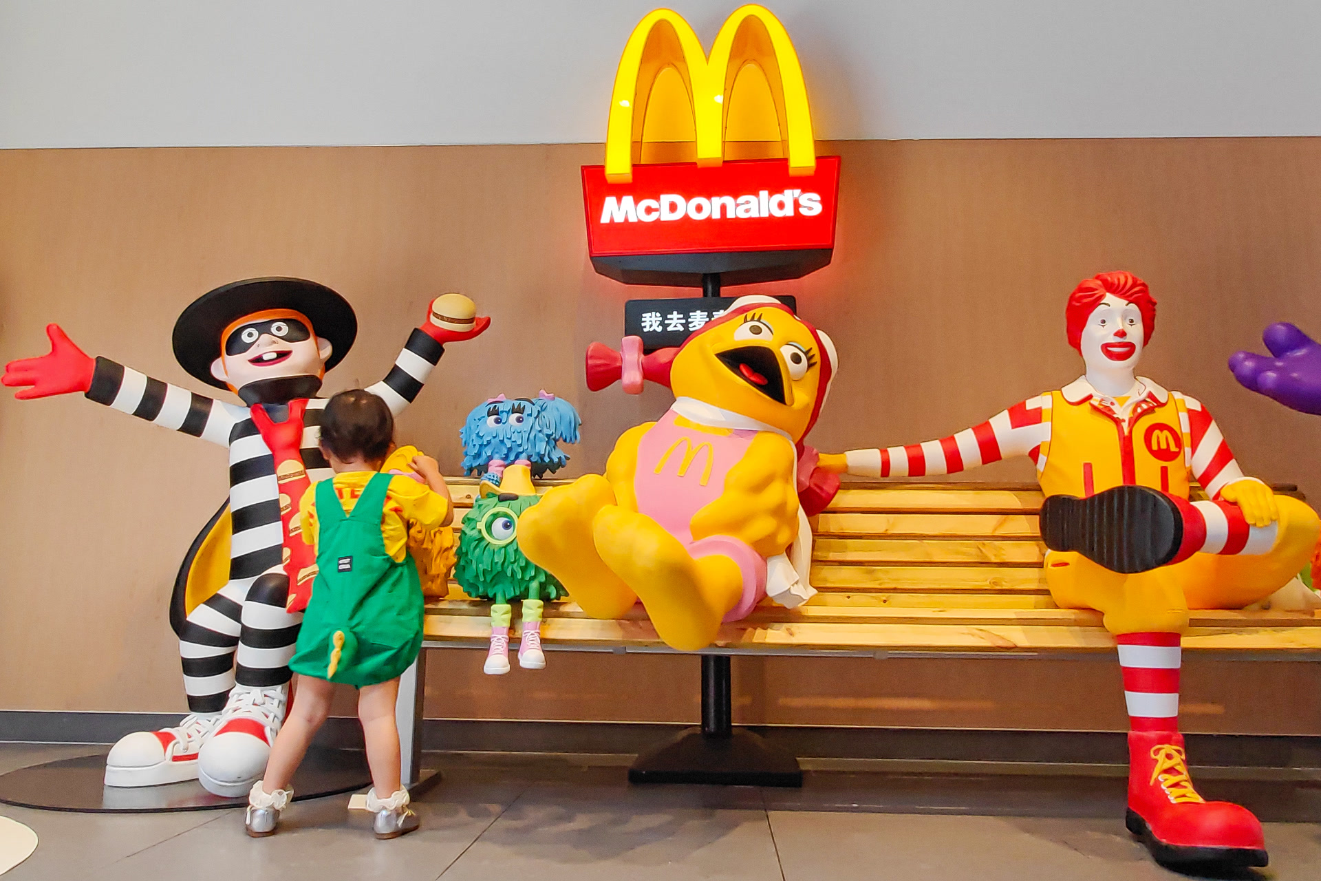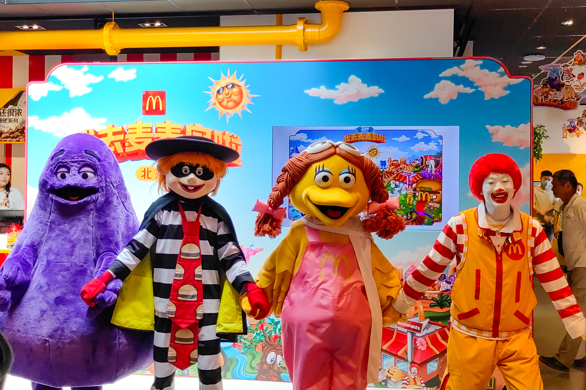 乘地铁出朝阳公园站,只见一间玻璃屋坐落在公园南门和地铁站之间。玻璃屋外贴满了各种欢乐的IP,比如抱着吉他演奏的“麦当劳叔叔”、坐着甜甜圈滑翔的“奶昔大哥”和“大鸟姐姐”、端着汉堡准备溜走的“汉堡神偷”……