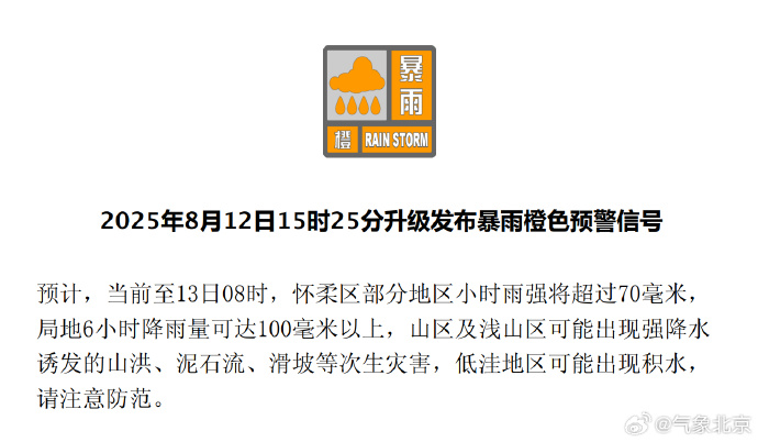 怀柔区气象台12日15时25分升级发布暴雨橙色预警信号