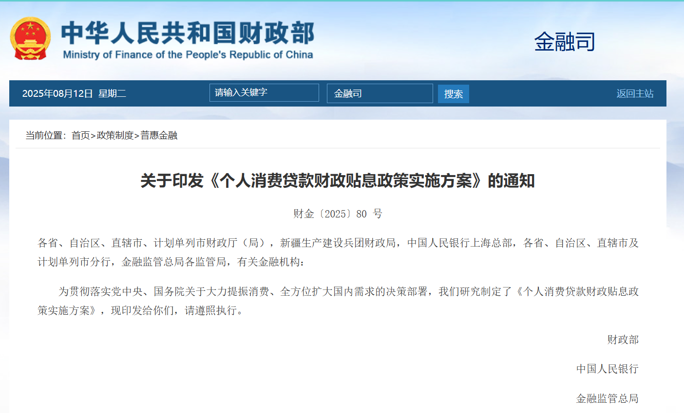 为降低居民消费信贷成本,助力释放居民消费潜力,新举措出台。8月12日,财政部、中国人民银行、金融监管总局公开发布《个人消费贷款财政贴息政策实施方案》,对符合条件的个人消费贷款给予财政贴息。