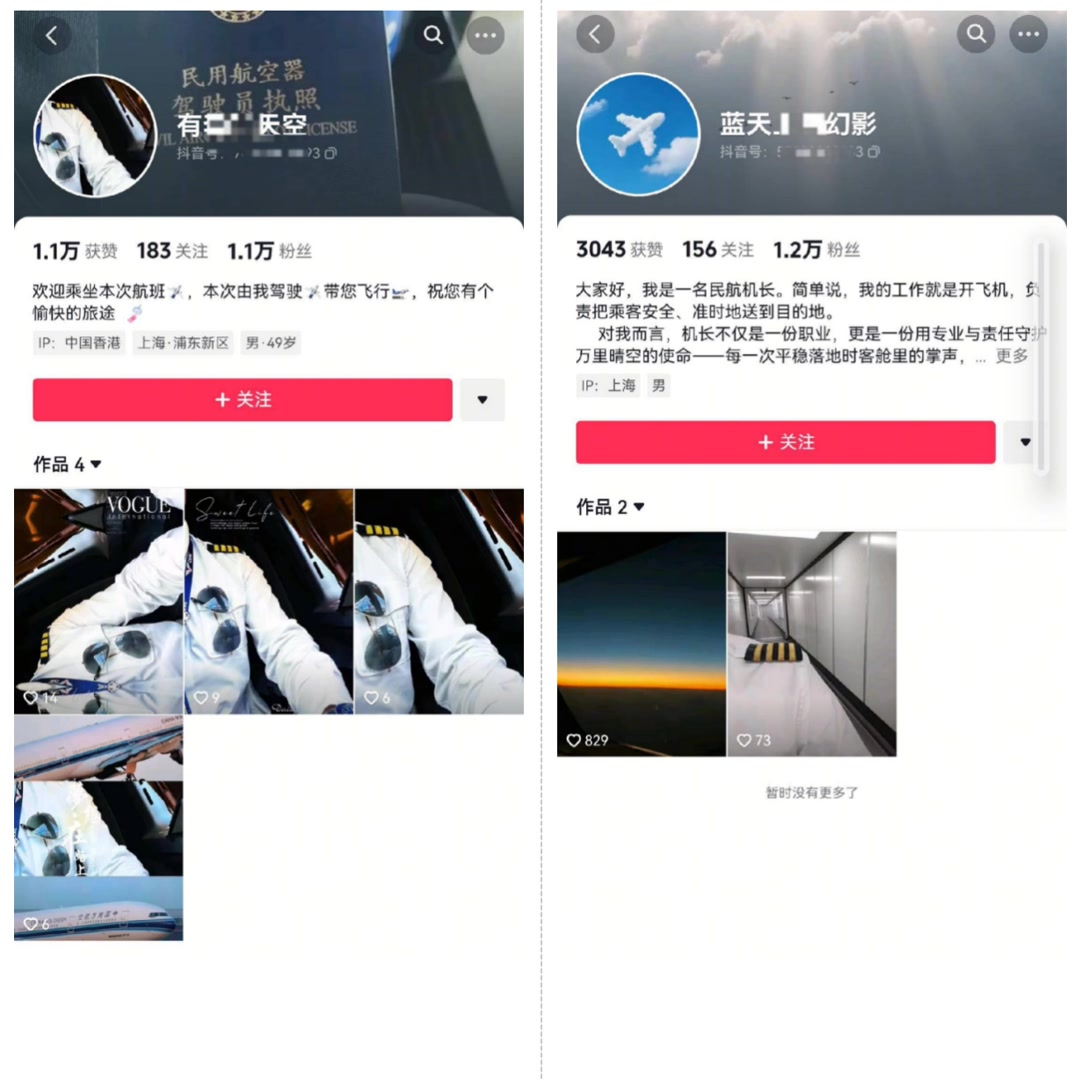 据介绍,此轮出现的 “民航从业者” 账号风格一致,往往通过虚假内容精准打造“机长”“飞行员” 人设,吸引异性注意。在账号简介里,他们常强调 “守护蓝天使命”“带乘客看世界”等透露职业身份的词条,并搭配阳光积极的生活感悟释放亲和力。作品内容则围绕 “飞行专业” 展开,例如驾驶舱视角、机组日常、机场打卡等场景,甚至有人会晒出 “民用航空器驾驶员执照”“机组制服” 等画面,用专业细节佐证身份真实性。