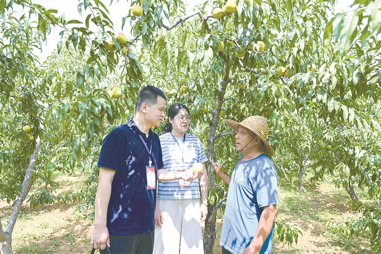 图为近日,费县纪检监察干部走访当地黄桃种植户,了解惠农政策落实情况。 刘广丛 摄