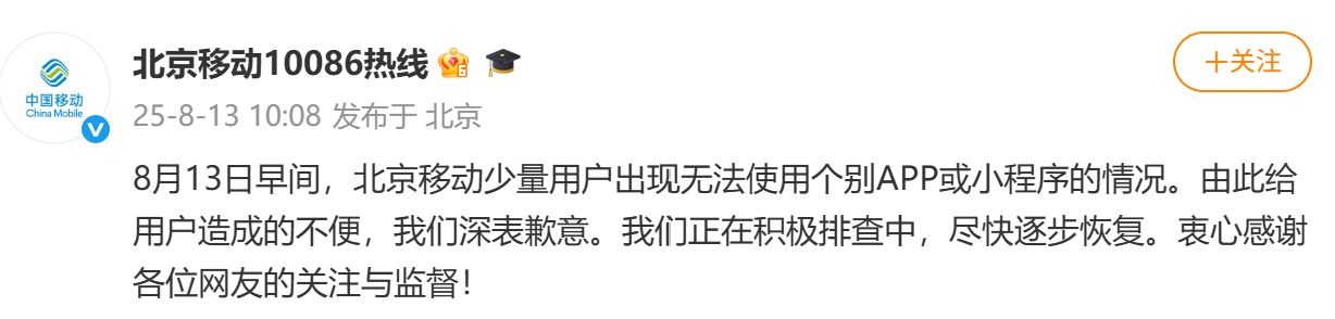 8月13日早间,北京移动少量用户出现无法使用个别APP或小程序的情况。由此给用户造成的不便,我们深表歉意。我们正在积极排查中,尽快逐步恢复。衷心感谢各位网友的关注与监督!