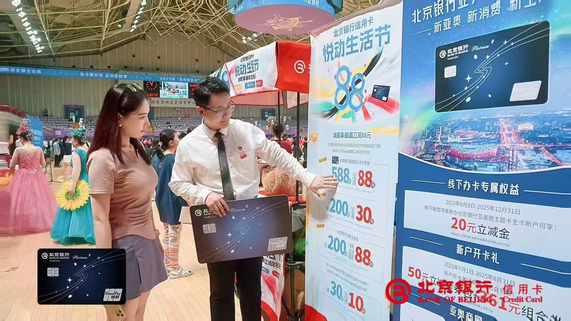 2025年8月8日,“悦动生活节”消费活动在亚奥核心商圈启幕。活动聚焦亚奥区域居民及持卡人需求,推出多重消费激励与便捷金融服务。持卡人可在亚奥地区北辰荟购物中心、新辰里购物中心(亚运村店)、上品+(奥运村店)、北京新奥天虹等商圈及连锁品牌享受满588元立减88元、满200元立减30元及满200元随机立减最高88元优惠,商户品类涵盖餐饮、零售、便利店、观影等丰富场景。此外,北京银行信用卡还特别在北辰荟购物中心设置达标抽奖点位,奖品丰厚实用,增添消费乐趣。