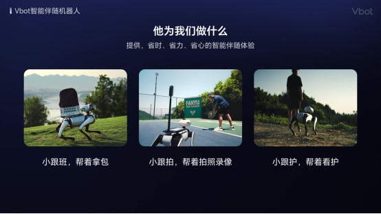 Vbot智能伴随机器人是面向家庭及个人用户打造消费级具身智能产品,为用户提供小跟班、小跟拍、小跟护的产品新体验,可以伴随家庭每一位成员的出行,帮着拿包,帮着拍照录像,帮着照看老人孩子。
