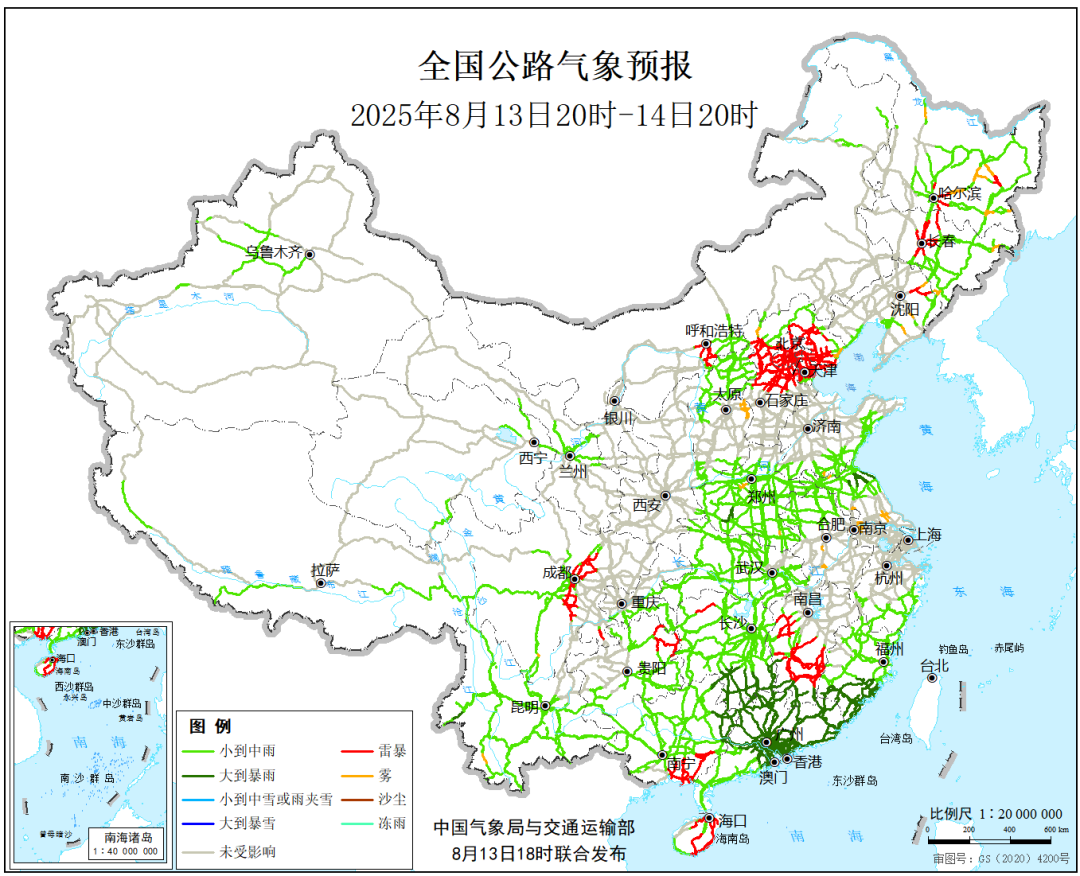 8月13日20时至14日20时,广东中东部和北部、福建东部和南部、江西南部、湖南南部、广西东北部、台湾岛南部等地有大到暴雨,部分地区有大暴雨,其中,广东东部、福建东南部局地有特大暴雨;北京、天津、河北北部、内蒙古中部、辽宁东北部、吉林中部、黑龙江南部、江西西部和南部、湖南西北部、广西南部、海南岛中部和东部、贵州东北部、四川东部等地局地有雷暴。另外,河北北部、山西中东部、辽宁东部、吉林东北部、黑龙江东部、江苏中部、安徽西南部、云南西南部等地局地有雾。