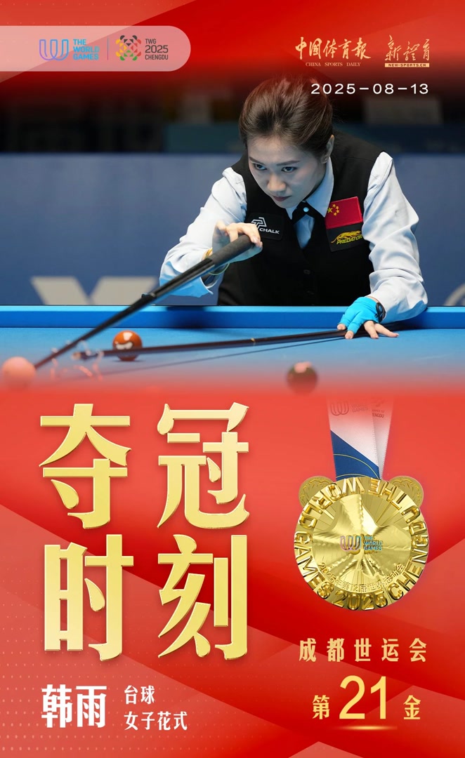 8月13日,在成都世运会台球女子花式决赛中,韩雨夺得冠军,为中国体育代表团摘得本届赛事第二十一枚金牌!这也是中国台球队在本届赛事斩获的第二金。