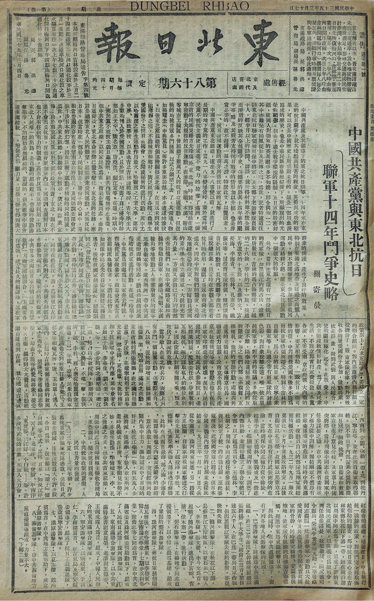 “中国共产党及其领导下的东北抗日联军,14年来在东北的抗日斗争,就其残酷与艰苦的程度,可以说是中国历史上空前未有的。这是一部用血泪写成的历史,也是中华民族在暴敌侵凌下,所显现出的光荣和骄傲。但由于过去环境的限制,及日寇的严密封锁,使国人对联军的英勇斗争很少知道……”