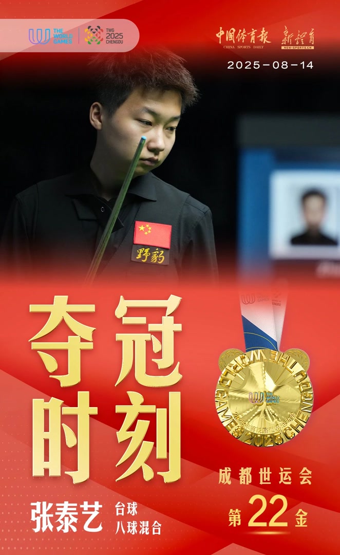 8月14日,在成都世运会台球八球混合决赛中,张泰艺夺得冠军,为中国体育代表团摘得本届赛事第二十二枚金牌!这也是中国台球队在本届赛事斩获的第三金。