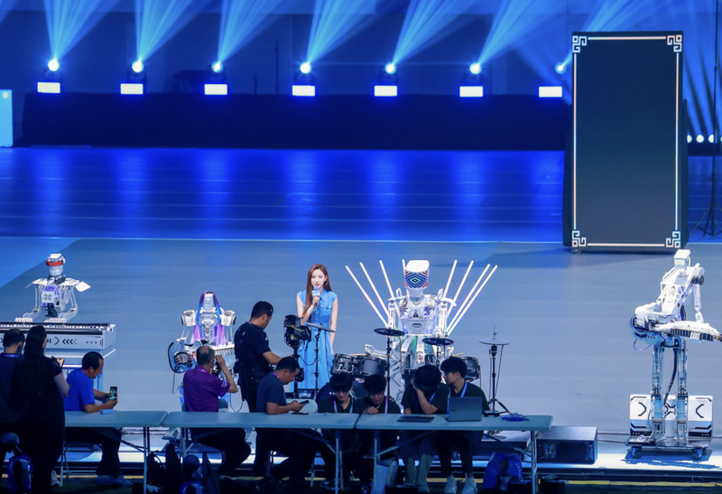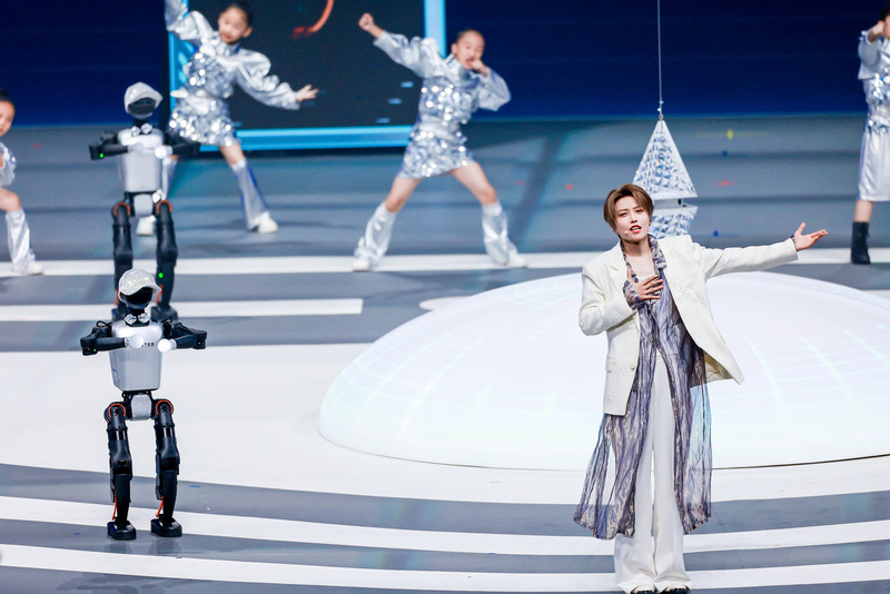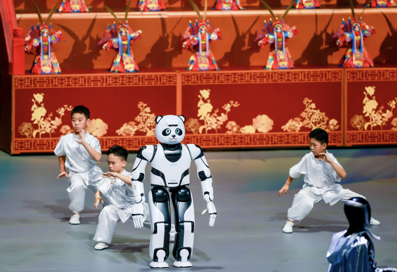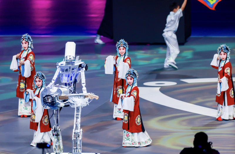 随后,传统文化创演节目《智韵和鸣》上演,巧妙地将戏曲、武术等中华优秀传统文化与机器人科技相融合,是本次开幕式中用到机器人梳理最多的表演节目。
