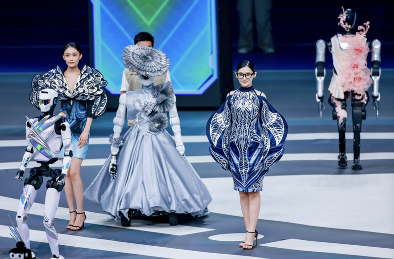 《天工霓裳》则打造了一个充满未来感的时尚秀场,机器人和人类模特共同演绎时尚融合国潮、非遗和科技元素的时装,为观众呈现科技和时尚完美融合的魅力。