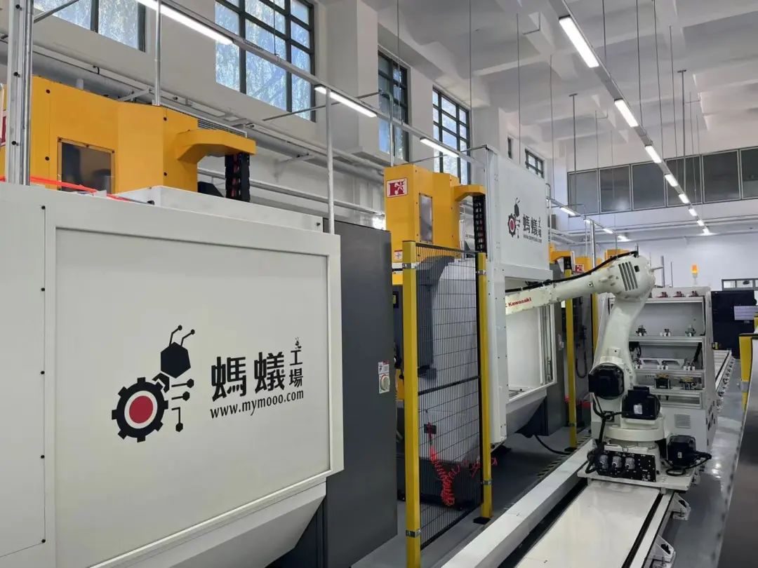 该基地由蚂蚁工场集团自主研发,包含机械零件柔性制造产线、智能生产管理软件、智能制造数字孪生系统、工业大数据应用平台、工业大模型应用平台、工业互联网平台六大模块,于今年8月在北京科技职业大学工程训练中心机械楼西车间完成调试并投入试运行。现场可以看到,产线总长30米,占地300平方米,配备6台CNC加工中心、1台六轴工业机器人、RGV轨道车、AGV智能搬运机器人及立体仓储系统,通过智能生产管理系统和数字孪生平台实现全流程智能化管控。产线最大亮点在于实现“秒级报价-分钟接单-小时交付”的敏捷制造能力,可满足人形机器人核心零部件小批量、多样化、高精度的试制需求,形成从原材料到成品的全自动化闭环生产。这条产线还承担着教学任务,专门为学生设置了10个实训工位,学生可实时观察产线运行数据与数字孪生仿真画面,实现“做中学、学中做”的沉浸式教学体验。