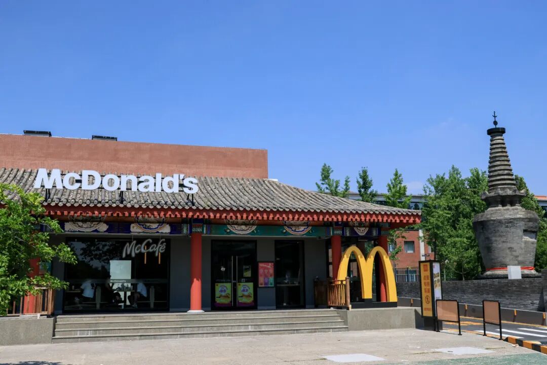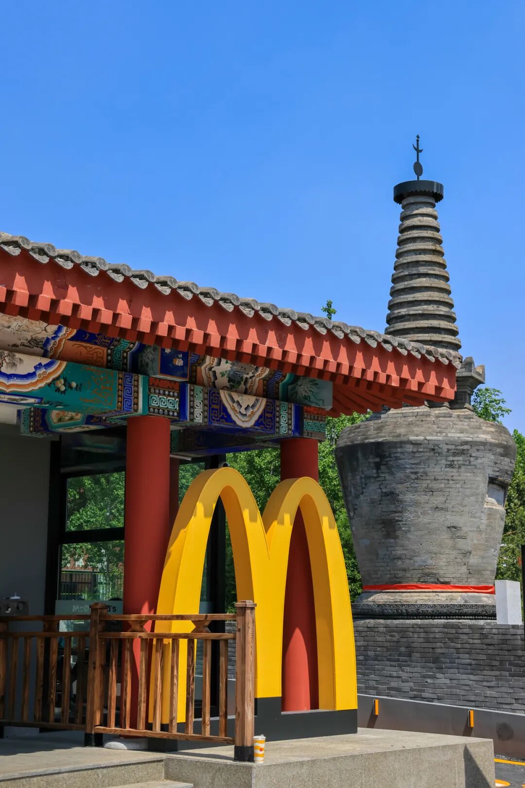 郎园Park中的麦当劳悄然焕新。店铺毗邻元代的崇国寺塔,古朴的黑瓦红檐,彩绘的屋脊线条,明亮的落地窗棂,经典的“M”标志,让这里成为一处独特的打卡地。