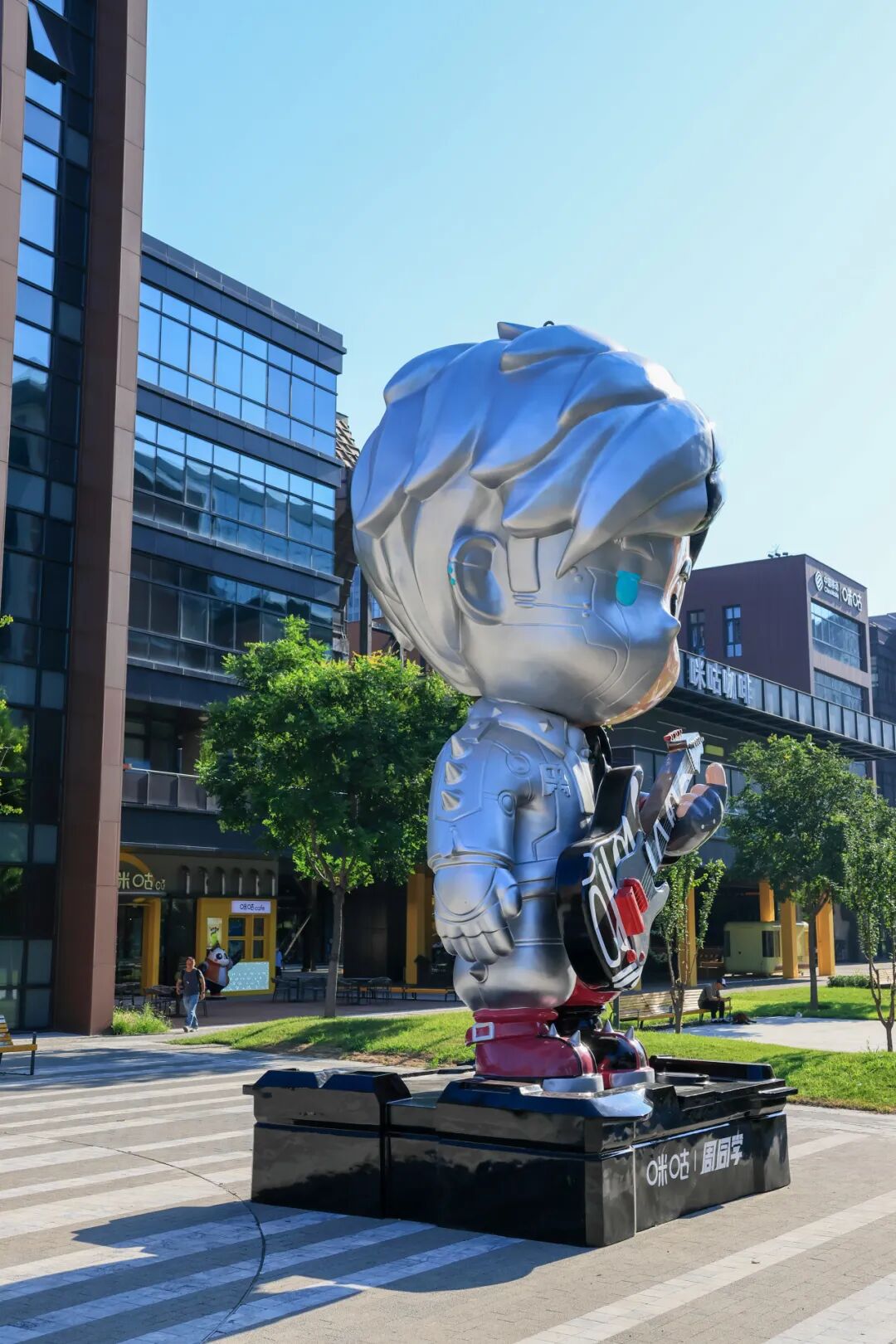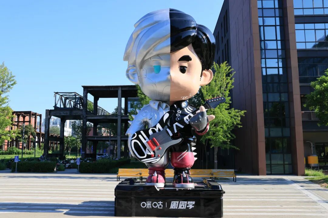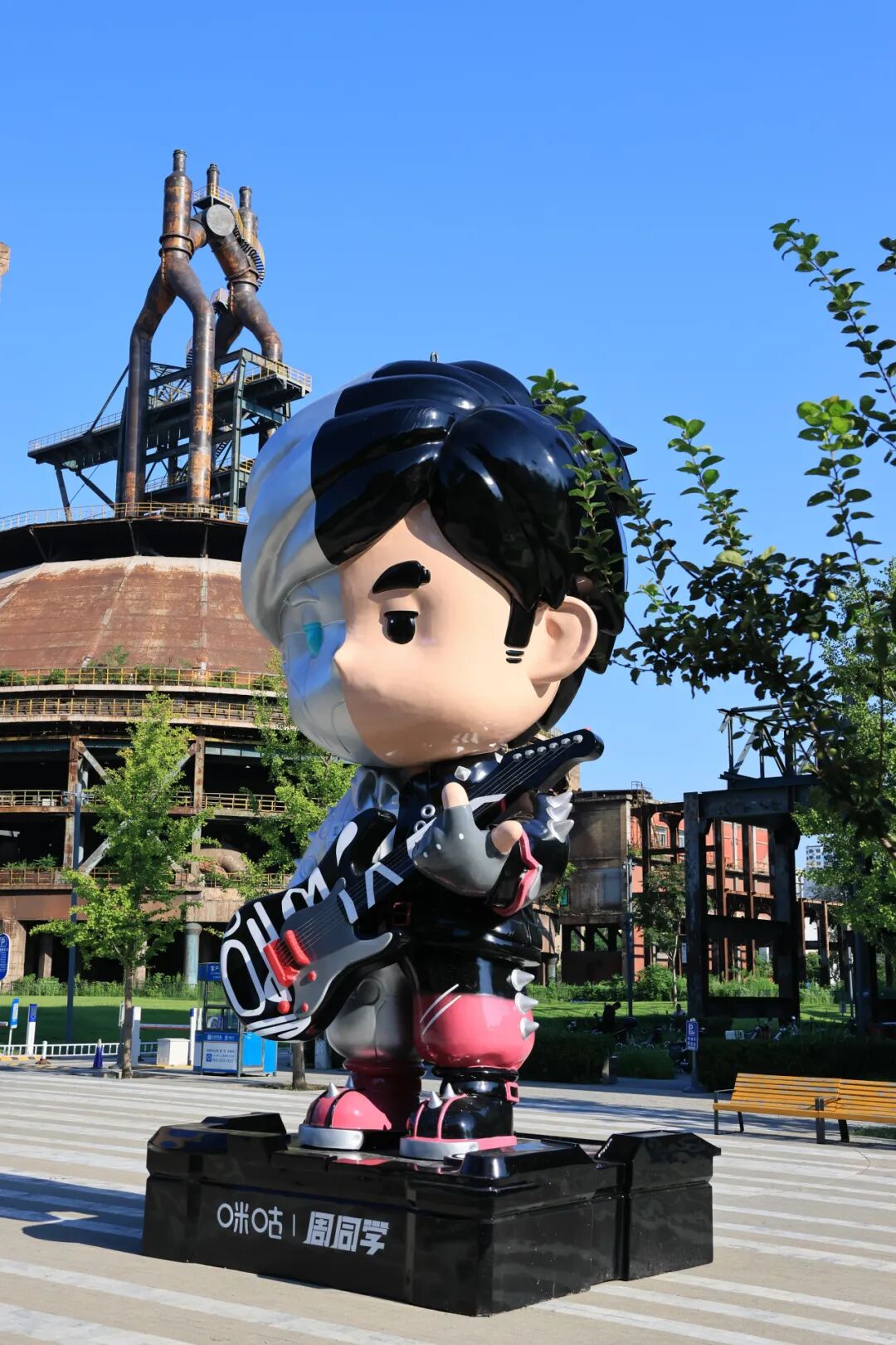咪咕x周同学星际开拓·周元宇宙系列空降首钢园啦!7米高的玻璃钢材质周同学大娃,怀里抱着电吉他,站立于咪咕大楼户外。一面是温柔潮酷的黑粉色碰撞,一面是科技动感的银蓝色结合,工业风与朋克风在此刻完美交融。