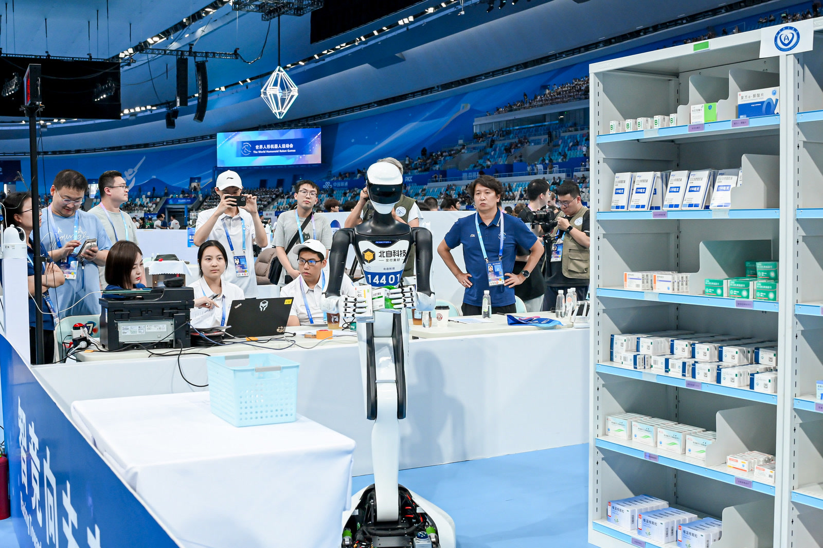 在国家速滑馆“冰丝带”赛场中央,医药场景的药品拆装初赛正在进行,来自中国人民大学的“RUC-HUHA战队”成员正戴着VR设备,远程操纵机器人进行药品抓取,他身边负责提供技术支持和指导的赵艺涵紧张地叮嘱道:“稳住!注意角度和方向。”5、6米之外,一台轮式双臂机器人正在团队的遥控下缓缓移动,对药品进行拆分和装盒。