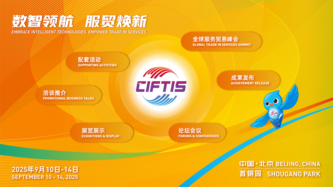 2025年中国国际服务贸易交易会(简称“服贸会”)将于9月10日至14日在北京首钢园举办。本届服贸会以“数智领航,服贸焕新”为年度主题,活动精彩纷呈。一起看看今年将有哪些亮点。