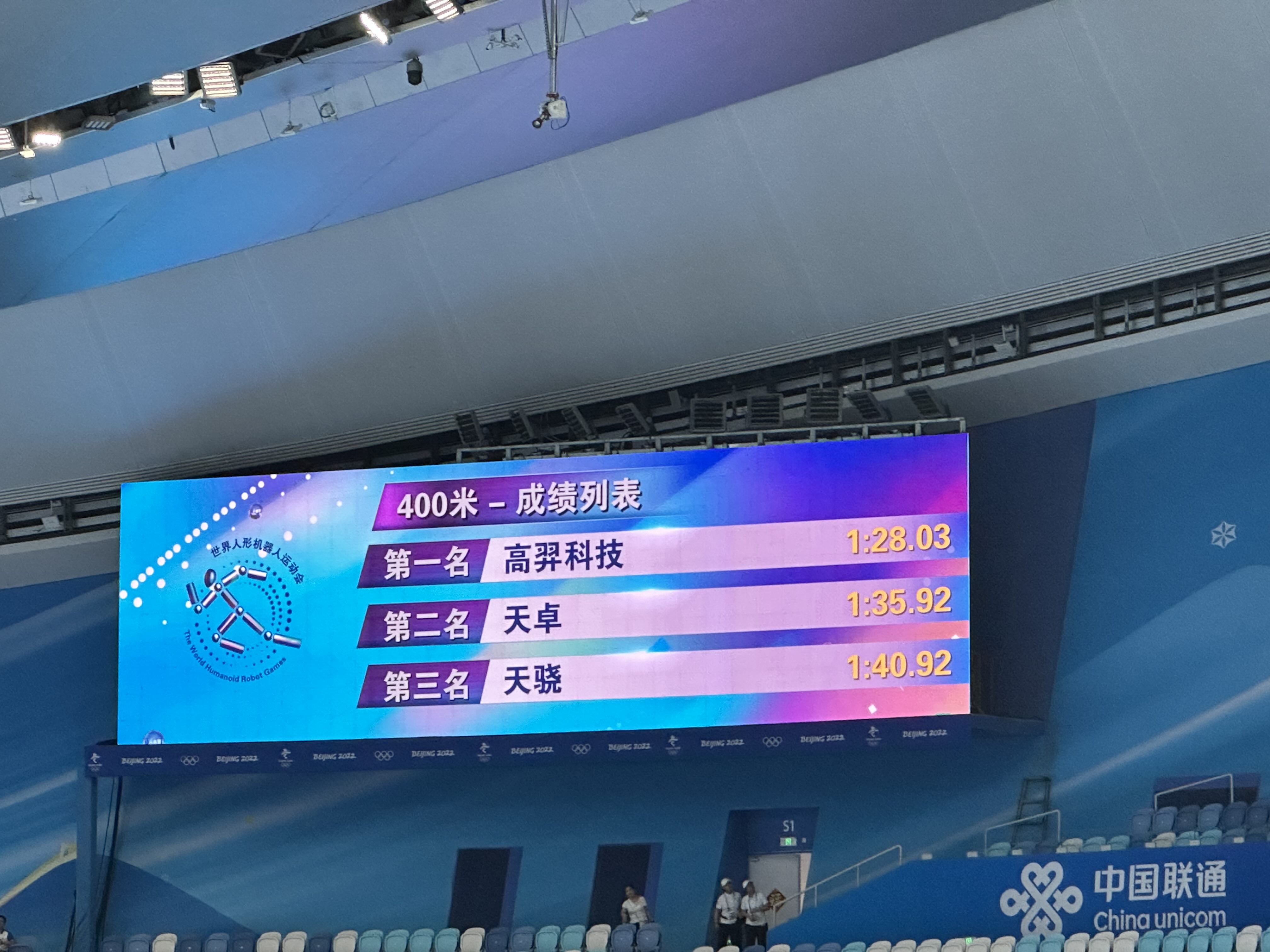 今天下午5点半,世界人形机器人运动会400米决赛上演。四名选手中,有3名是北京人形机器人创新中心的天工,另一名是高羿科技(宇树科技上海子公司)的H1。从刚刚公布的成绩来看,高羿科技队以1:28.03夺得冠军,天卓、天骁队的天工Ultra获得亚军和季军。