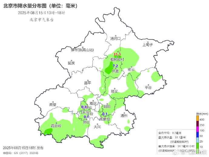 据@气象北京,15日13-18时全市平均降水量0.7毫米,城区平均0.6毫米。最大降水量出现在怀柔椴树岭村31.1毫米;最大降水强度也出现在该站,17-18时降水31.1毫米。