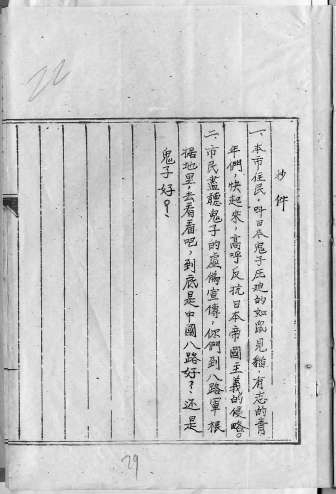 本市住民,叫日本鬼子压迫的(得)如鼠见猫,有志的青年们,快起来,高呼反抗日本帝国主义的侵略。