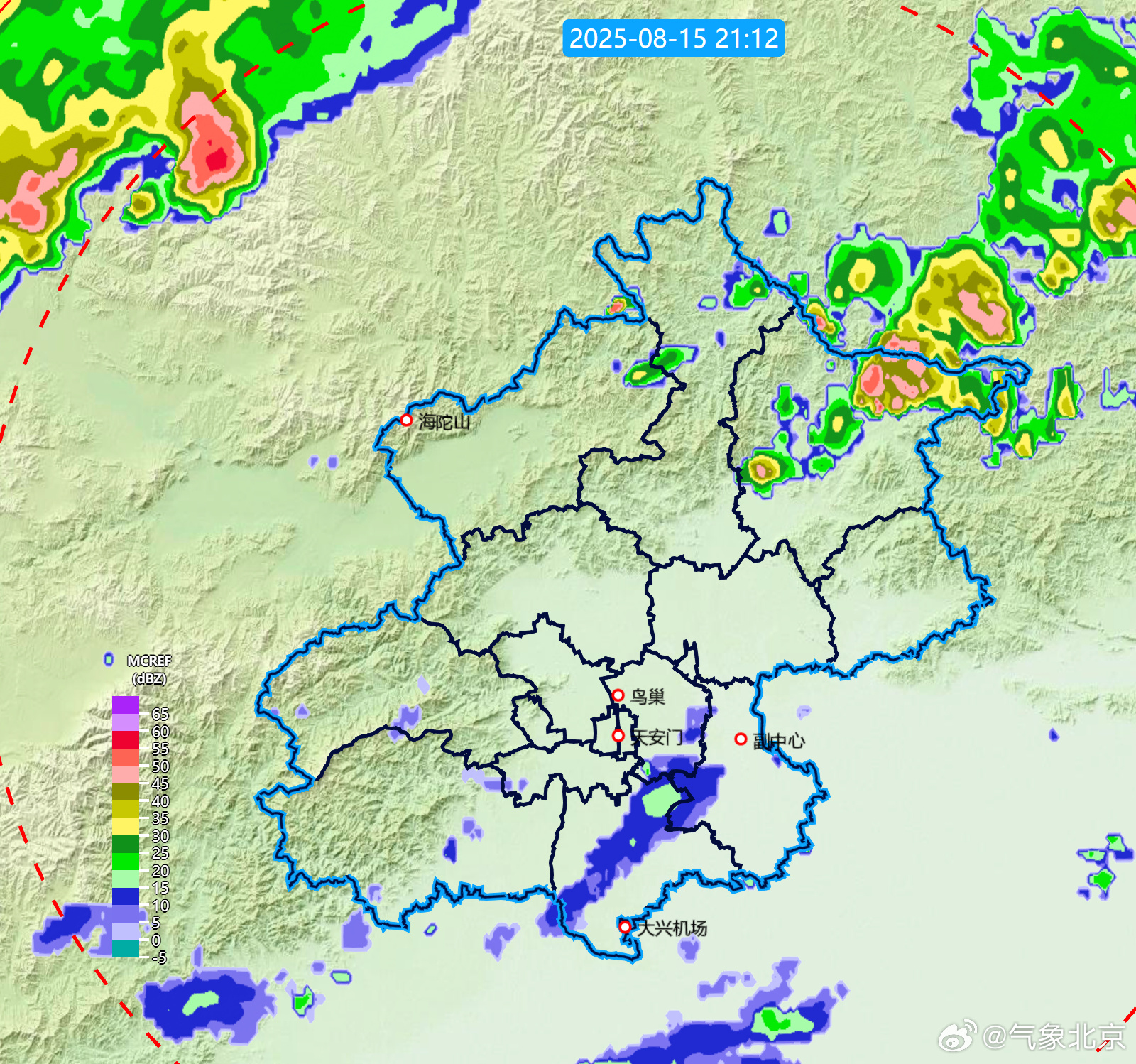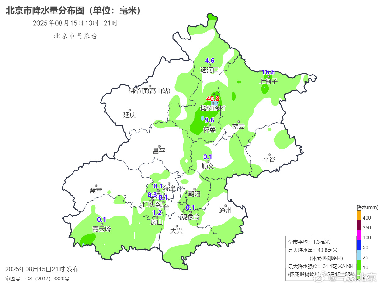 15日13-21时全市平均降水量1.3毫米,最大降水量出现在怀柔椴树岭村40.8毫米。最近一小时(20-21时)最大为密云瑶亭26.4毫米。
