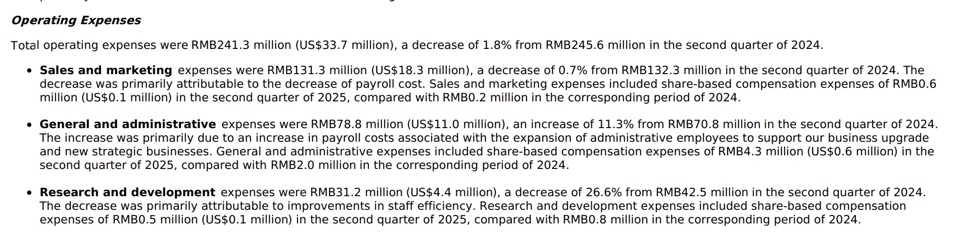 运营费用方面,新氧第二季度总运营费用为2.413亿元,较2024年第二季度的人民币2.456亿元下降1.8%。其中,研发费用为3120万元,较2024年第二季度的人民币4250万元下降26.6%。