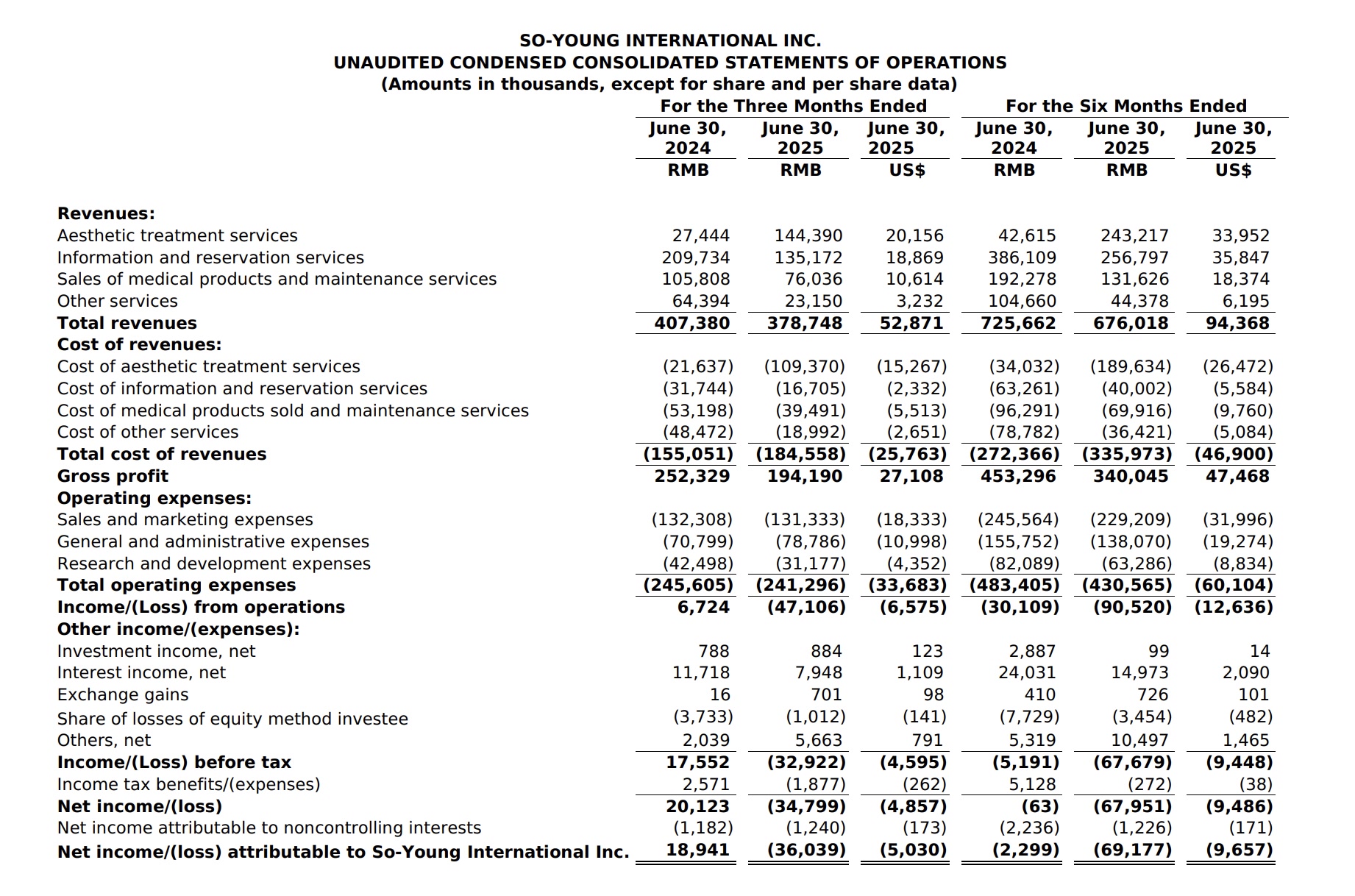 8月15日,医美与消费医疗服务平台新氧科技公布第二季度财报。财报显示,第二季度,新氧总营收为3.787亿元,2024年同期为4.074亿元,同比下滑7%;净亏损为3600万元,2024年同期为净利润1890万元;在非美国通用会计准则(Non-GAAP)下,新氧经调整后净亏损为3050万元,2024年同期为净利润2220万元。