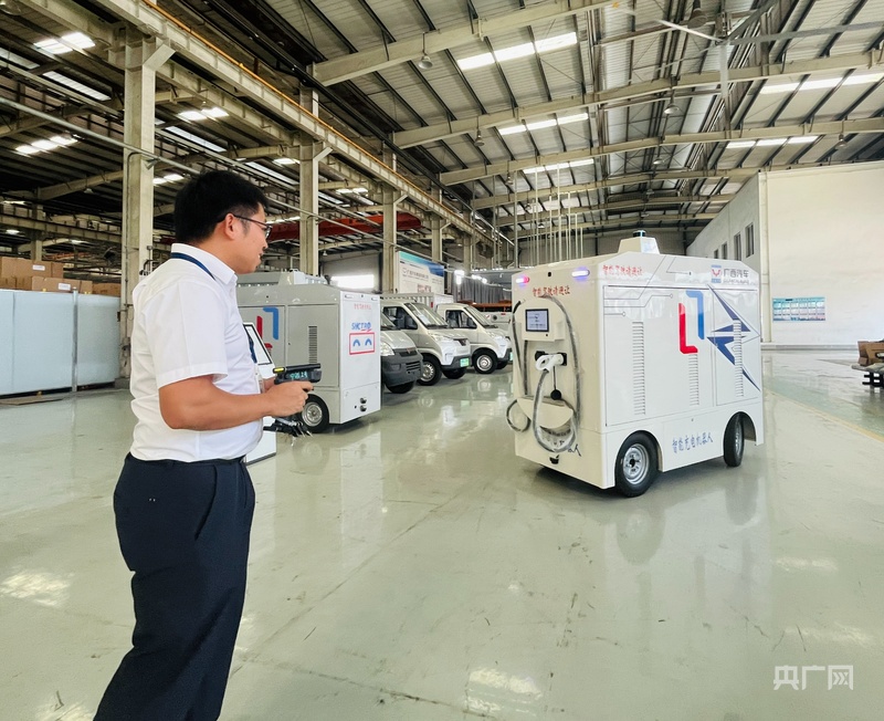 广西汽车集团场区,移动充电机器10秒规划路线,精准对接新能源汽车充电(央广网见习记者 滕艳娇 摄)