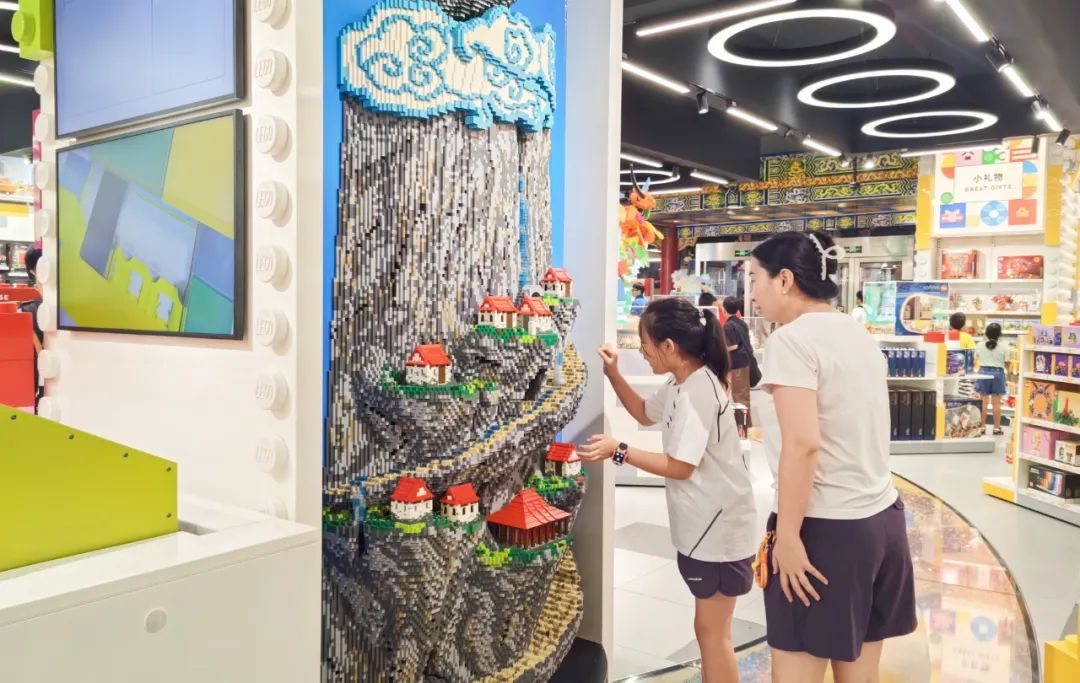 小朋友和家长一起在银泰中心的乐高选购商品。