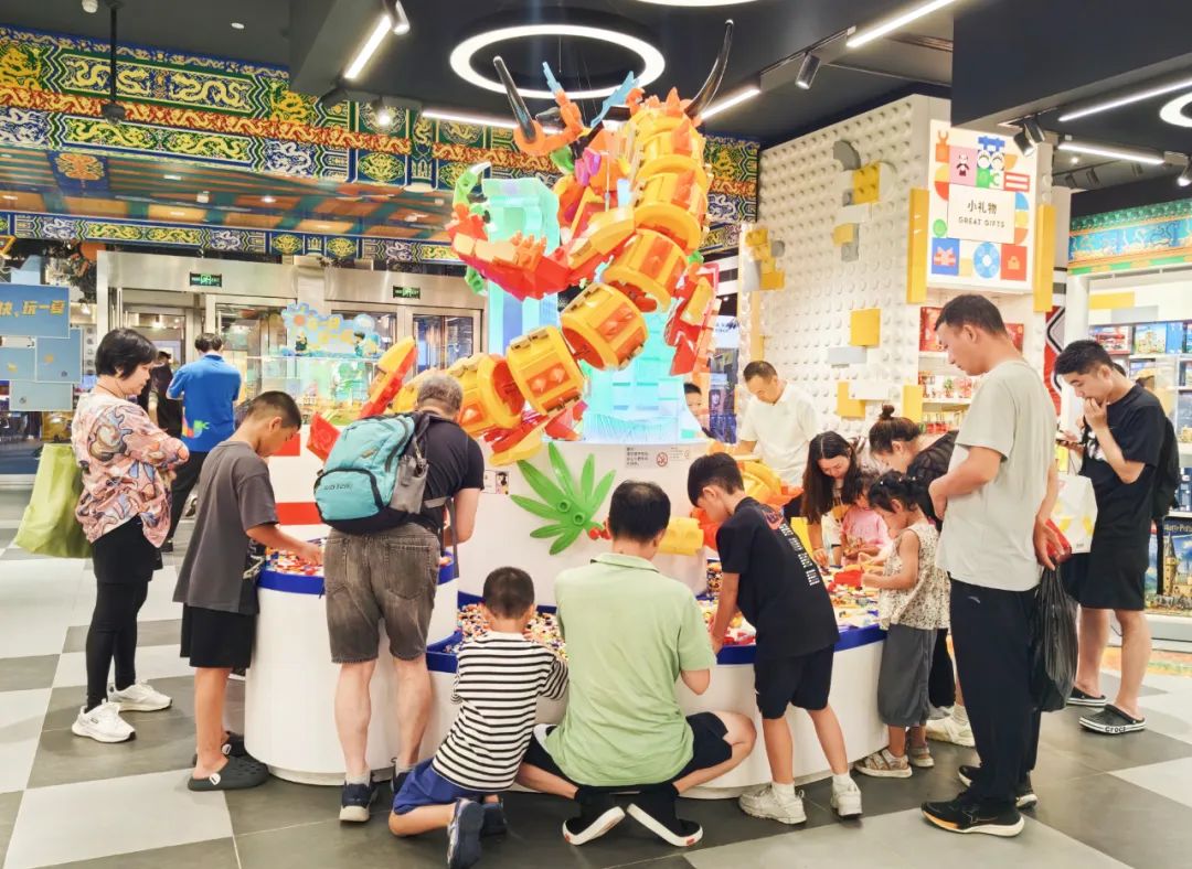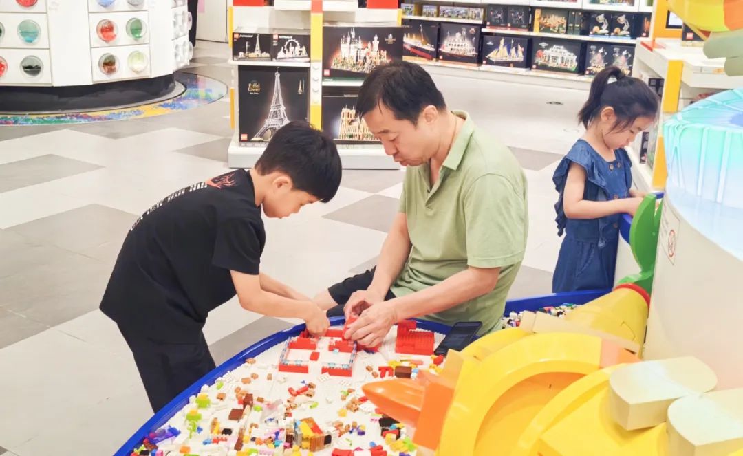 从地铁8号线金鱼胡同站出站直达银泰in88,一层的乐高店像一座彩虹色的创意工厂,货架上摆满了按颜色、形状分类的积木块,有巴掌大的迷你套装,也有半人高的城堡模型。暑假特设的“拼搭工作台”前,坐满了“小工程师”,孩子们齐心合力,正在一起搭建属于他们的梦幻城堡。家长们有的在一旁当“助理”,帮忙找特定形状的积木,有的在旁边的座椅上休息。