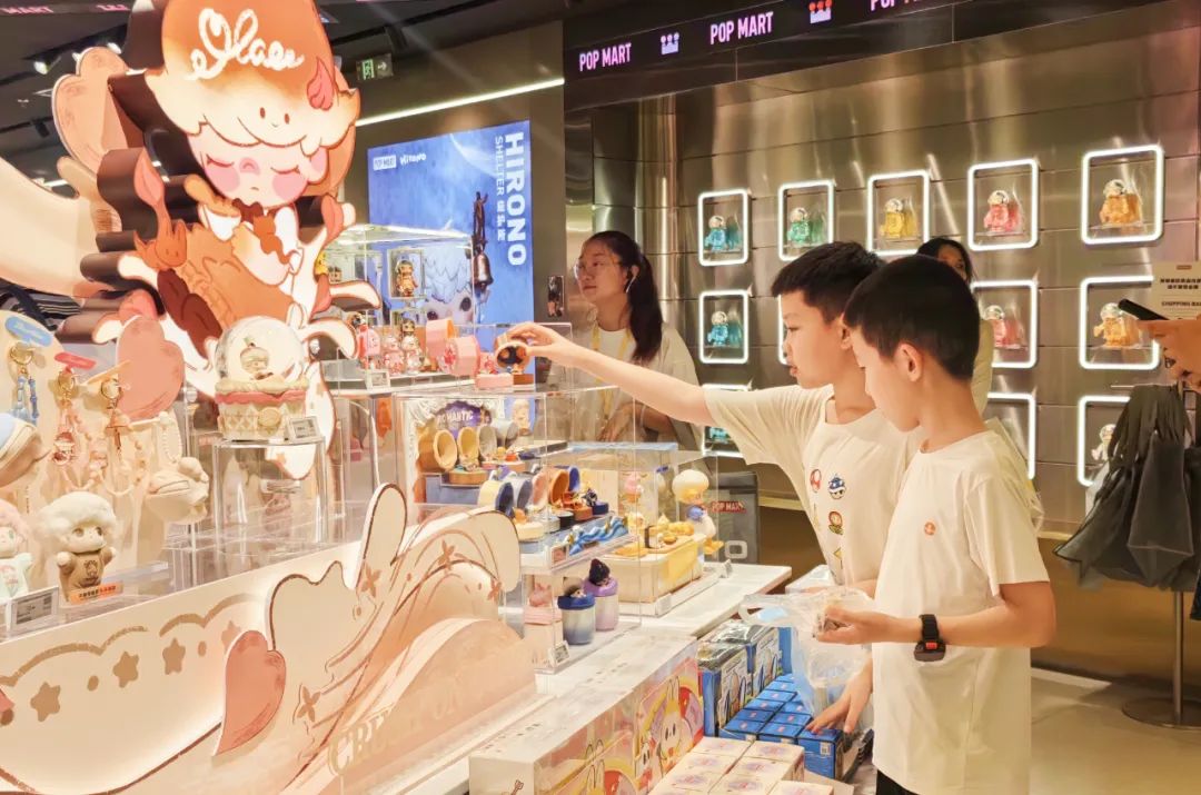 沿着王府井大街继续向南走,就到了北京apm商场,地下一层的泡泡玛特门店则是另一种热闹。透明展柜里,各个系列盲盒排得整整齐齐,孩子们趴在柜台上,小手在盒子上摩挲,有的嘴里念念有词:“一定要抽中隐藏款!”有的还会自发结成“盲盒交换角”,一来二去认识了新朋友。