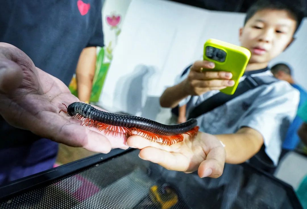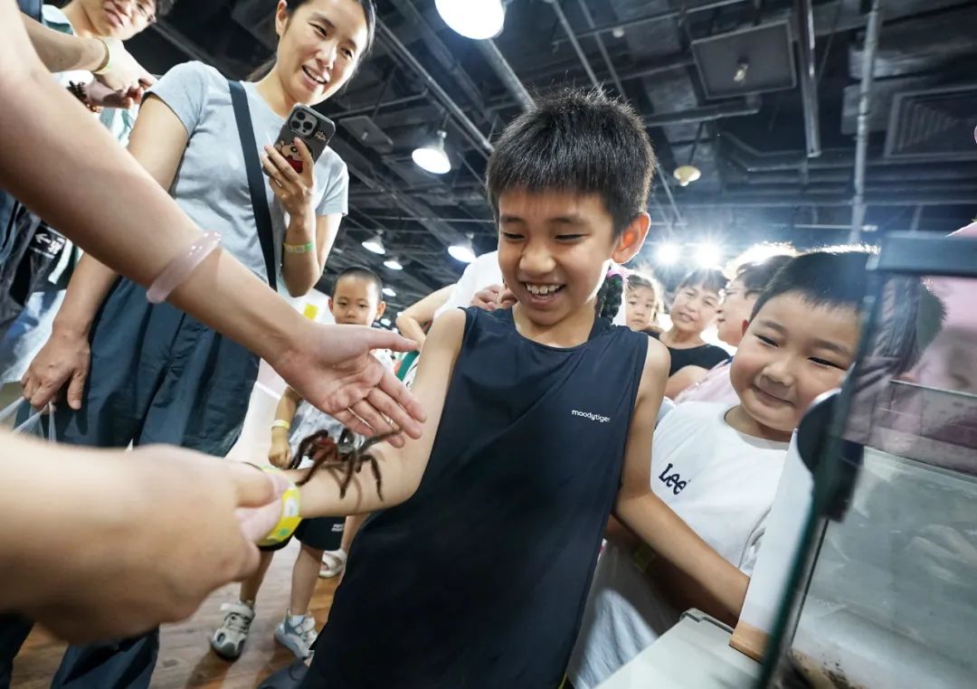 推开玻璃门,潮湿的草木气息扑面而来,3000平方米的空间里,模拟热带雨林的温湿度让孩子们瞬间忘记了门外的暑气。穿白大褂的讲解员正举着放大镜,给围得里三层外三层的孩子展示竹节虫的隐身术;活体展区里,色彩斑斓的蝴蝶在网室里翩跹,胆大的孩子敢伸手让蚕宝宝在掌心爬行,感受不一样的触感;标本墙前,从几厘米长的甲虫到展开翅膀近半米的巨蛾,配上详细的习性卡片,让孩子们在哇声中悄悄记下这些自然知识。