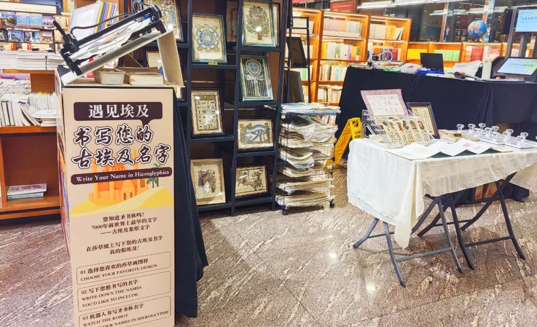 暑假里,王府井书店还举行了各种活动,其中“遇见埃及”的活动现场排满了准备用莎草画图样写下自己名字的小朋友们,另一边,还有正在往本子上盖带有古埃及文化印章的三两好友。