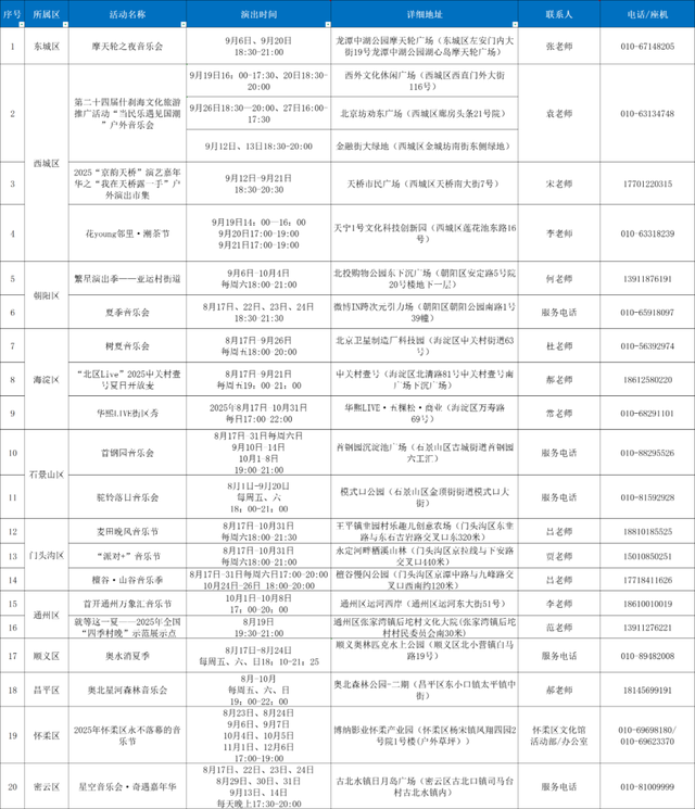 东城区摩天轮之夜音乐会将邀请光圈音乐现场等演出团队,演绎耳熟能详的经典流行曲目。西城区将在北京坊等3个点位推出“当民乐遇见国潮”户外音乐会,邀请北京民族乐团将传统民乐演奏与现代舞台科技创新融合,表演影视金曲、经典民乐、武侠配乐等经典曲目。顺义区奥林匹克水上公园的奥水消夏季以“运动、音乐、美食、露营”为核心体验,推出“青春不散场”民谣、“经典旋律”互动及电音派对等多元曲风,满足不同年龄段观众的音乐需求。