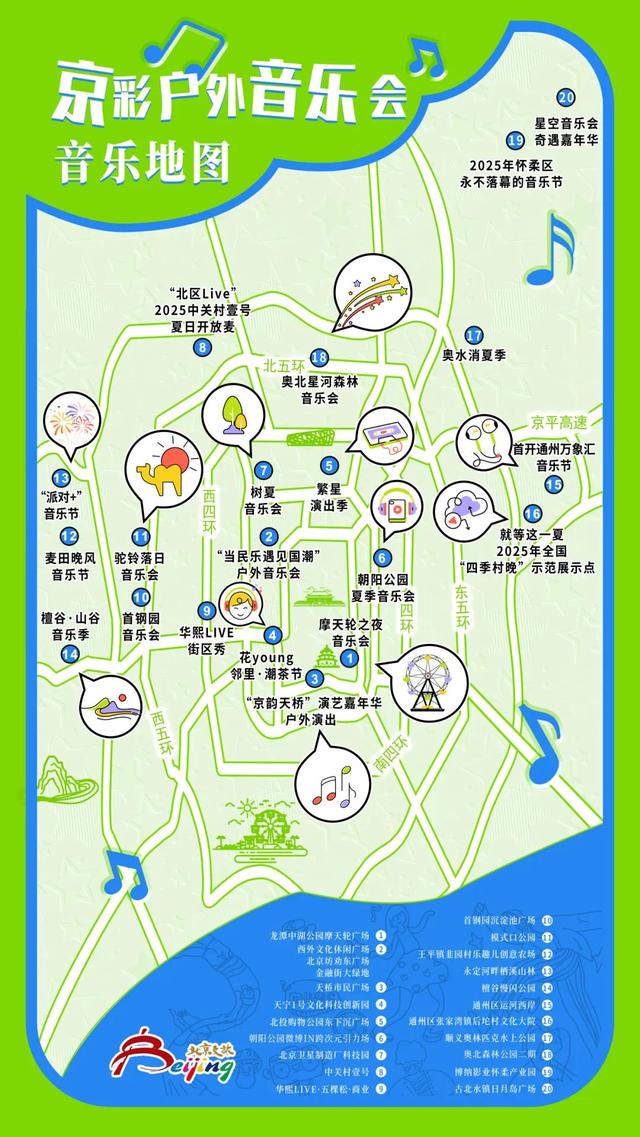 在龙潭中湖公园、朝阳公园、奥林匹克水上公园等6个公园,漫步休憩间感受生态与艺术融合;在北京卫星制造厂科技园、首钢园、博纳影业怀柔产业园等5个园区,体验不同建筑风格与音乐曲风交织的魅力;在大栅栏北京坊、亚运村、华熙・五棵松等4个商圈,逛街之余邂逅动人旋律;在门头沟永定河栖溪山林河畔,流水潺潺间尽享静谧时光。