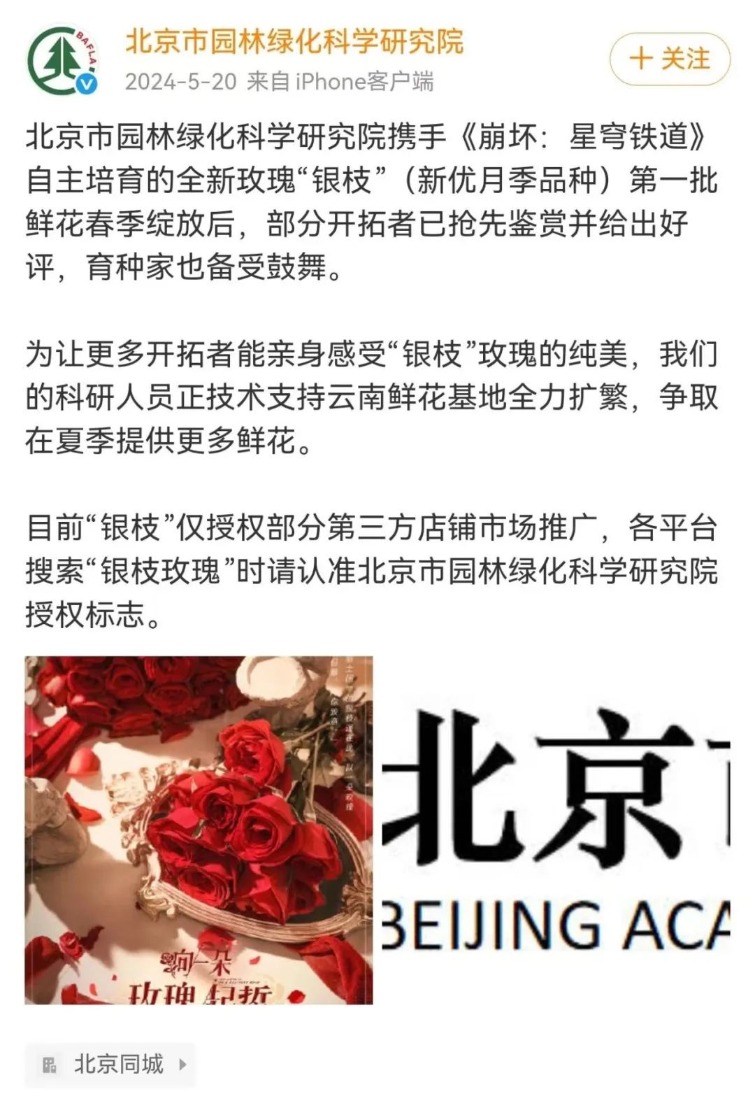 园科院和米哈游共同申请知识产权,将这一品种命名为“银枝”,参加现场活动的人每人还能领一支“银枝”,感受虚幻和现实相结合的浪漫。