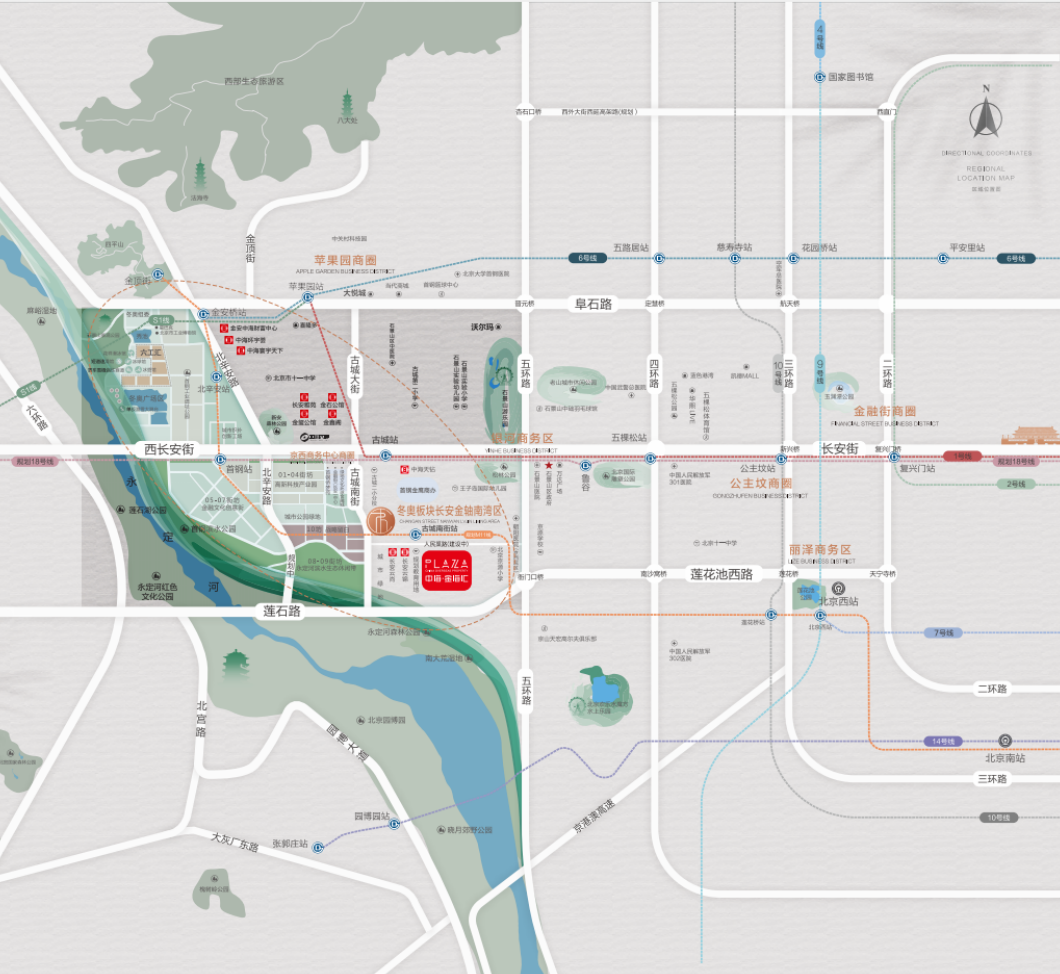 地理位置优越,东距西五环约1.5公里,南距莲石路约200米,北距长安街西延线约1.3公里,近邻地铁1号线古城站、规划地铁11号线古城南街站。这里还有四横四纵主干道,近距苹果园、金安桥双枢纽引擎,无论是自驾还是公共交通出行都十分便利。